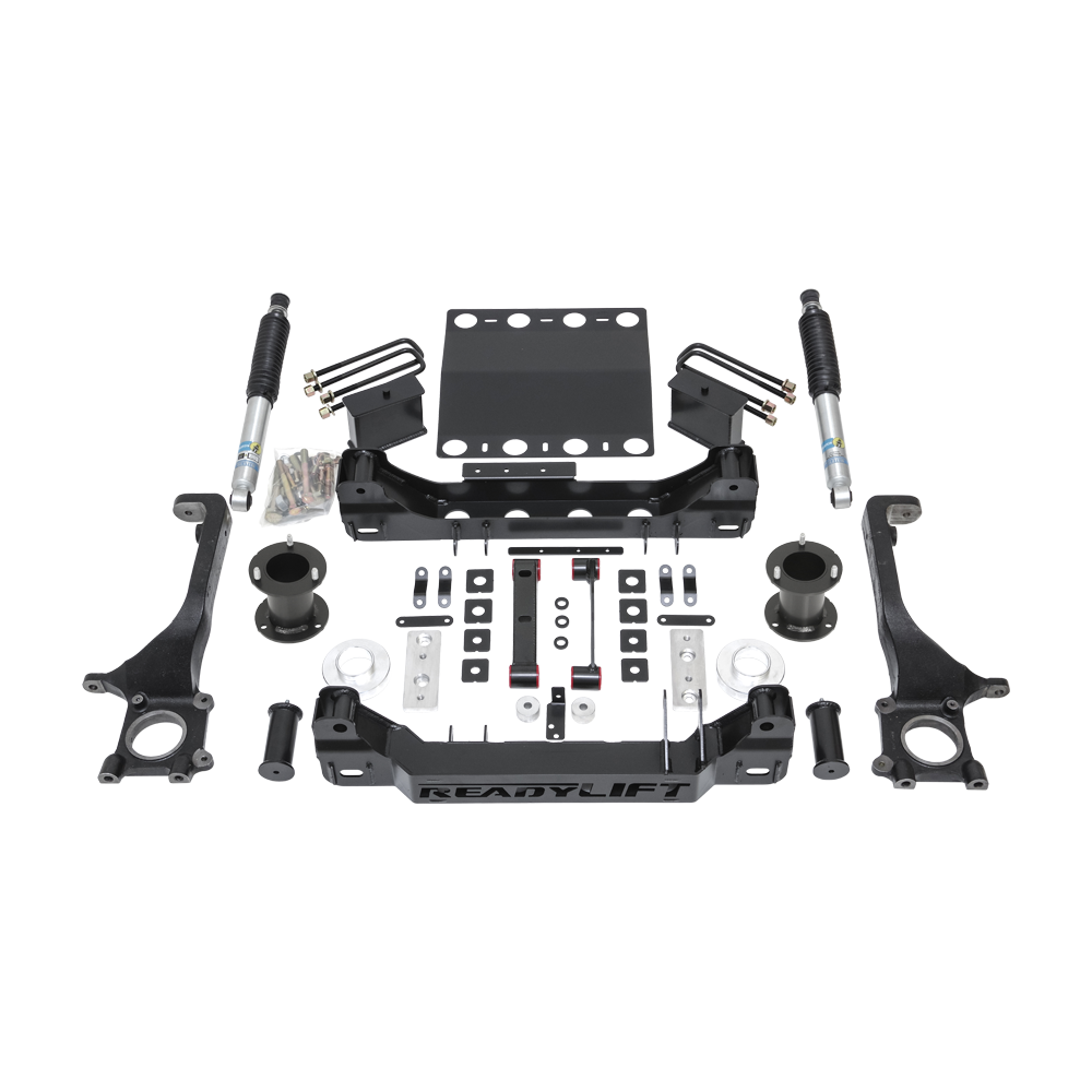 ReadyLIFT is proud to introduce the all-new 6" Big Lift Kits for 2005-2015 Tacoma trucks, designed for SR, SR5, TRD Sport, TRD Off-Road & Limited models, excluding 5-lug Tacoma, TRD Pro, TX Baja, or XSP-X models. This kit, using drop bracket style engineering similar to Tundra lift kits, allows a 6-inch front lift with heavy-duty top mount offset strut extensions, ensuring a true front lift. The kit boasts features like precision-engineered cast iron lift knuckles for perfect alignment geometry, retention of factory sway bar mounting locations, and compatibility with the factory skid plate and gravel guard. It includes heavy-duty, laser-cut, CNC-bent steel cross members to lower the front differential, maintaining frame integrity. The rear setup includes 5-inch tall fabricated steel lift blocks and Bilstein 5100-series shocks. Tested for over six months on real roads, this kit supports up to a 35x12.50 tire on a 9" wide wheel with +12, 0, or -18 offsets, requiring a minimum 18" wheel diameter. Additionally, the kit is tested on a 2018 MY Tacoma with TSS-PCS, proving that it doesn't hinder the vehicle's safety features like electronic stability control, airbags, and other high-tech features. The tests confirmed that the active and passive systems recognized operating conditions and took appropriate actions, maintaining factory safety system effectiveness.