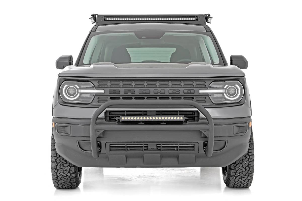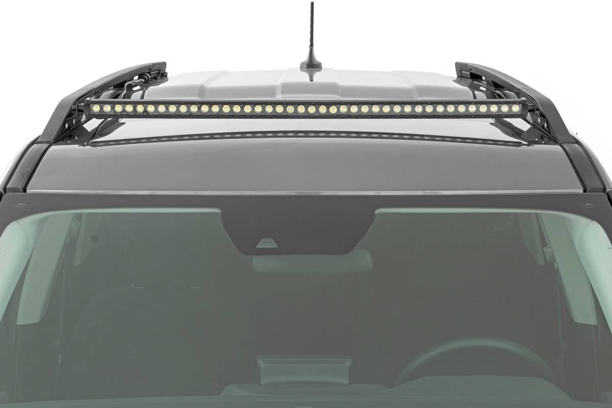 COMMAND THE DARK with Rough Country's 40-inch LED Upper Windshield Light Bar Kit. This easy-to-install kit is the ultimate solution for adding an aggressive looking, forward-facing lighting system to your Bronco Sport! With its modern, stylistic design and superior strength, this upper windshield mount holds your 40-inch Light Bar between the roof rack of your Bronco Sport spanning the width of the roof and giving a killer look.