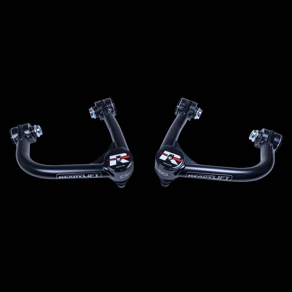 ReadyLIFT's all-new Upper Control Arms provide the strength of a race-style uni-ball arm with the ride quality and characteristics of factory parts through the use of a newly designed High Angle Ball Joint. These new arms offer increased strength and travel for your suspension, with corrected geometry and alignment after your vehicle is lifted. The new UCA's are designed for OE like ride quality on-road without the noise of traditional uni-ball arms. "Our proprietary pivot bushings used inside the control arm pocket, ReadyLIFT uses proprietary Terrain Control Technology bushings to ensure quiet, durable, and stable pivot performance. Finally, ReadyLIFT arms are powder-coated for an attractive yet durable finish combined with a sealed dust cap providing for years of quiet performance. UCA Kits Features and Benefits: - Includes DOM tube steel upper control arms. - Designed for lift height of 1"-4" ReadyLift - Compatible with stock wheels and tires. - TCT - Terrain Control Technology maintenance-free pivot bushings. - Proprietary Heavy-Duty High-Angle Ball Joint - Allows for increased strength and angle for greater wheel travel for lifted applications without sacrificing ride quality. - Billet O-Ring Dust Cap and Sealed Ball Joint Assembly - Protects the ball joint assembly from corrosion, dirt and debris in harsh off-road conditions. - Gusseted Pivot and Ball Joint Housings - Designed for maximum clearance and engineered for maximum strength. - Super-durable polyester Black Powder Coat Finish is Long-lasting, maintains a premium look, and protects from humidity and corrosion. NOTE: DO NOT EXCEED AN ASSEMBLED COILOVER LENGTH OF 25" DO NOT EXCEED A COLLAPSED COILOVER LENGTH OF 17" CAN BE USED WITH 66-21100, 69-21200, 66-21210, 69-21300 AND 69-21400 CAN BE USED ON A STOCK "SASQUATCH PACKAGE" EQUIPPED VEHICLE.