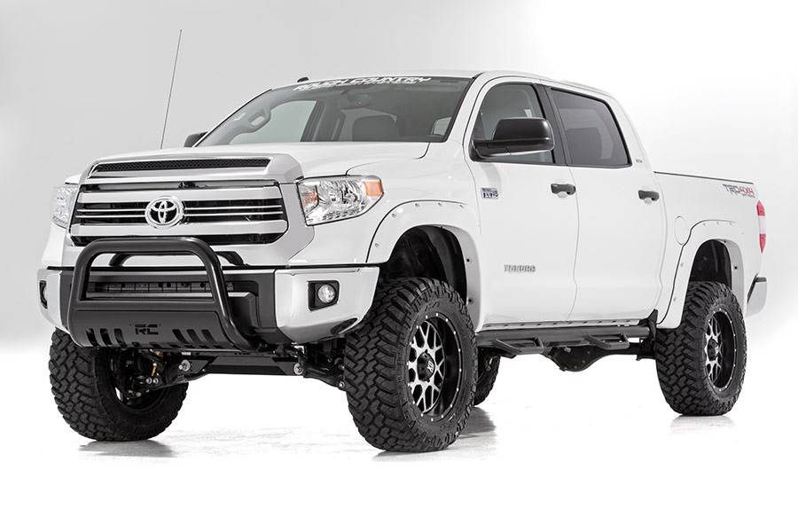 You'll never look at a Tundra the same way after installing Rough Country's 6-inch Toyota Tundra kit. This all-inclusive kit is a total transformation for your truck, with durable lifted knuckles, protective skid plate, and all the brackets and hardware needed to set your truck to a factory-like geometry while providing additional ground clearance. The beefy front crossmember features a high-clearance design to help traverse off-road obstacles with no hang-ups.Run larger wheels and tires while giving your truck a one-of-a-kind look and exceptional off-road performance. This kit affords your truck an aggressive appearance and a higher profile that is sure to demand attention. This kit includes Rough Country's Adjustable Reservoir Vertex Shocks for the ultimate balance in highway ride quality and off-road vibration dampening. Includes Rough Country's Lifetime Replacement Guarantee.
