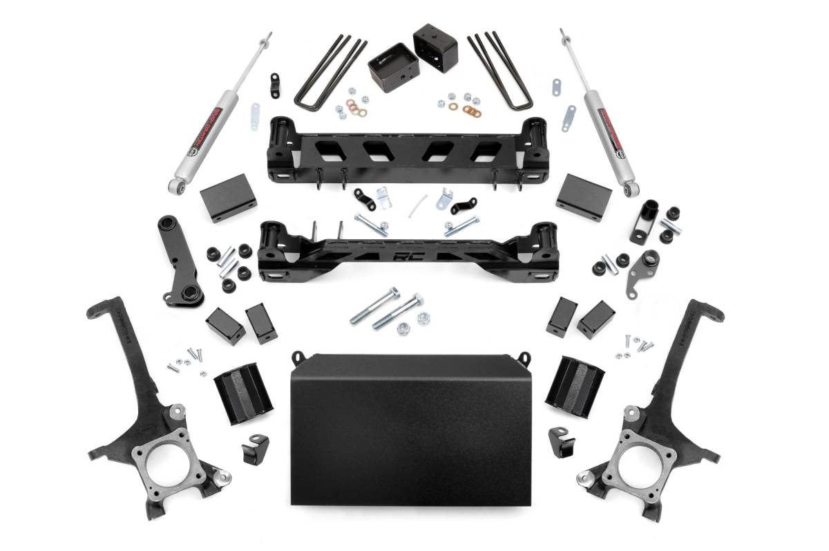 Take your Toyota Tundra to the next level with Rough Country's 4.5in Suspension Lift for 07 & up models. With heavy-duty components and a high-clearance design, this kit offers aggressive looks, unparalleled off-road performance, and enough ride height to run up to 35in tires. Instantly gain a meaner lifted and level stance with high-quality equipment that's made to handle the hazards of high-performance while withstanding the test of time. A set of durable lifted knuckles, high-clearance front and rear crossmembers, upper strut spacers, and long-lasting, fabricated rear blocks give you plenty of lift and uncompromised toughness. This all-inclusive kit features everything you need to take your Tundra off the tread and through the trenches featuring steering stops, brake line brackets, differential drop brackets, sway-bar drop brackets, and anything else one would need to keep everything working at optimum angles after lifting. Best of all, you can get up and running with Rough Country's 4.5in Toyota Tundra Lift at a price that won't break the bank!