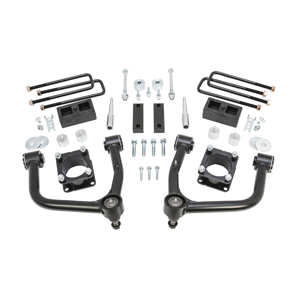 New - now includes ultra strong TCT free floating pivot bushings that are self lubricating and eliminates friction. ReadyLIFT is proud to offer a 4" SST Lift Kit for the 2007-2020 Toyota Tundra trucks. (Note: Not for use on 2015-21 Tundra TRD Pro w/ Bilstein TRD Pro shocks.) The overwhelming popularity of our 4" SST Lift Kits fueled the necessity to engineer a similar proven popular kit for the full size Toyota trucks. This kit is packed full of great features starting with our DOM steel tube upper Control Arms with extended duty ball joints and tough TCT urethane bushings. These Control Arms are designed to retain OEM ball joint angles while also providing necessary strut/coil over clearance during suspension droop cycling. Also included are a pair our time tested powdercoated steel top mount strut extensions that will provide 4.0" of lift. Differential drop spacers and skid plate spacers with new hardware are also included as are new rear shock extensions and front bump stop extensions. This kit also includes OEM-style 2.0" rear lift blocks and u-bolts to bring the rear of Tundra trucks up for a really nice and level-but-lifted stance. No details were skipped with this kit! We even include new front sway bar frame mount spacers as well as brake line bracket extensions to maximize the true professionalism of this kit. This SST Kit is asy to install and fully capable of retaining OEM alignment geometry figures. Unlike other kits, the ReadyLIFT 4" SST suspension system requires no cutting or strut spring pre-loading and installs safely using the provided heavy-duty hardware. Quality step-by-step instructions are provided with every kit.