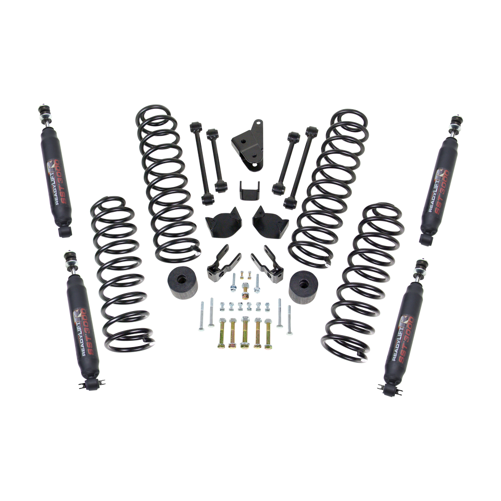MOAB Tested! Trail Proven! ReadyLIFT is proud to offer a 4" Coil Spring Lift kit for the 2007-2018 Jeep Wrangler JK! This kit offers four (4) precision crafted coil springs to ensure unsurpassed on-road manners as well as increased off-road capability. Kit includes four (4) replacement front and rear sway bar end links, rear track bar relocation bracket, new bump stops and bump stop pads to ensure the correct articulation of your suspension. The ReadyLIFT 69-6401 kit INCLUDES four (4) SST3000 shocks. The ReadyLIFT 4.0" Coil Spring Lift Kit lifts your Jeep JK Wrangler 4.0" in front and 3.0" in the rear for a lifted and level stance suitable for installation of 35" tall off-road tires. With the use of "flat fenders" you can install 37" tall tires. This kit allows you to confidently take your Jeep anywhere you want, on or off road, without sacrificing a quality ride or handling characteristics. The increased ground clearance provides many more off road opportunities than with a stock suspension along with the ability to install larger wheel and tires for the truly great lifted off road appearance! NOTE: 2012-UP vehicles will require driveshaft and exhaust modifications. Recommend 47-6310 stainless steel exhaust spacer for 2012-up Jeeps for off road use. NOTE: Installing a lift kit on any solid axle vehicle will alter the position of the axle. This can be corrected with the addition of an available adjustable track bar.