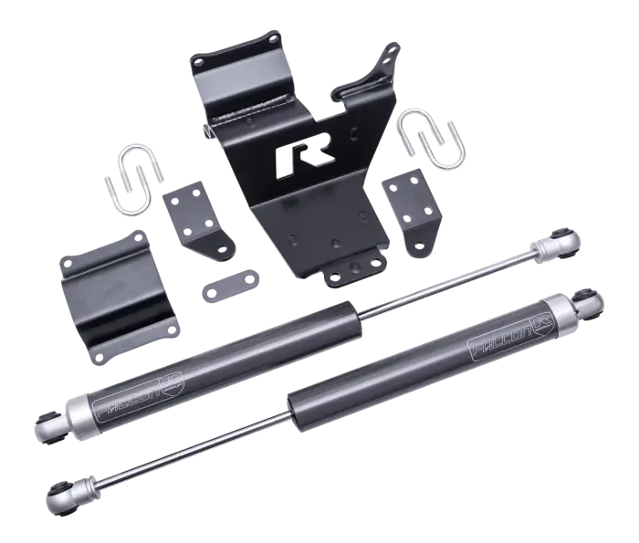 ReadyLIFT introduces its new Falcon-equipped Dual Steering Stabilizer System (PN 77-23201), engineered specifically for Ford F-450 and F-550 Super Duty trucks with the 10-lug front axle. Designed for heavy-duty applications including oversized wheels and tires, towing, and uneven terrain, the dual stabilizer design helps reduce steering vibration, improve response, and minimize bump steer—resulting in smoother handling, improved on-center feel, and reduced driver fatigue.Featuring dual Falcon steering dampers and purpose-built mounting brackets, the system integrates cleanly with ReadyLIFT leveling and lift kits to deliver a factory-quality, high-end appearance with confident steering performance under load.Key Features • Purpose-built for F-450/F-550 10-lug front axles • Dual Falcon steering stabilizers for improved control • Reduces vibration and wandering from oversized tires • Compatible with leveled or lifted 4WD trucks • Bolt-on installation with no permanent modificationsBuilt for Heavy-Duty ConfidenceWhether towing, hauling, or daily driving, ReadyLIFT's Dual Steering Stabilizer delivers the stability, comfort, and control 10-lug Super Duty owners need to manage heavy loads and long miles with confidence.