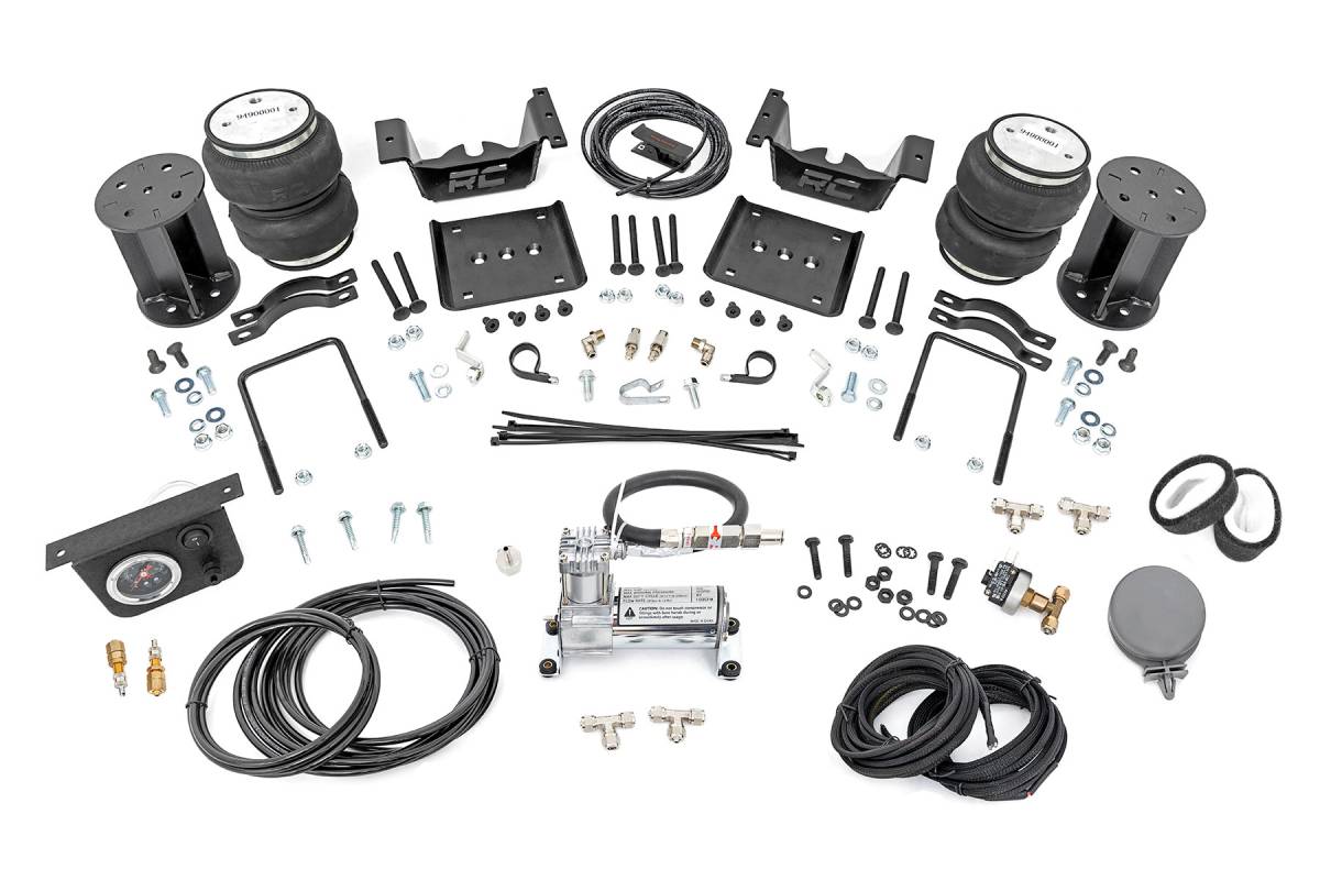 Ideal Leveling: Is your truck your workhorse? The main attraction of a pickup is the ability to haul and tow as needed. However, due to the weight in the bed or the condition of the rear leaf springs, your vehicle may become un-level under load. At Rough Country, we've designed a solution to eliminate these concerns. Introducing Rough Country's Rear Air Spring Kit. Heavy-Duty Construction: Rough Country's Rear Air Spring Kit includes two high-quality, double convoluted air bags, reinforced with durable powder-coated steel brackets and DOT-approved airlines. Whether you're towing a trailer or hauling heavy loads, this kit helps ensure your vehicle remains level, alleviating the strain on your trailer's tongue weight. The kit features 1/4" push-to-connect air fittings for easy installation, along with all necessary bracketry for a secure fit. Rough Country's Air Spring Kit supports up to 5,000 lbs. of load, minimizing sway and preventing bottoming out while braking and steering. Easy Installation: Quick and simple setup for immediate use. Rough Country's kit can be installed at home with standard tools in just 5-6 hours, ensuring minimal downtime and fast, hassle-free installation. Onboard Air Compressor and Wireless Controller: For added convenience, Rough Country offers an optional onboard air compressor and wireless controller to easily adjust your air spring kit on the go. Control air pressure at the push of a button from the comfort of your vehicle. Reliable Warranty Coverage: Rough Country's Rear Air Spring Kit includes a limited lifetime warranty on the air springs and a two-year replacement warranty on the compressor, offering lasting protection against manufacturer defects. This industry-leading coverage ensures confidence in both quality and durability, so you can count on Rough Country to keep your truck performing at its best.