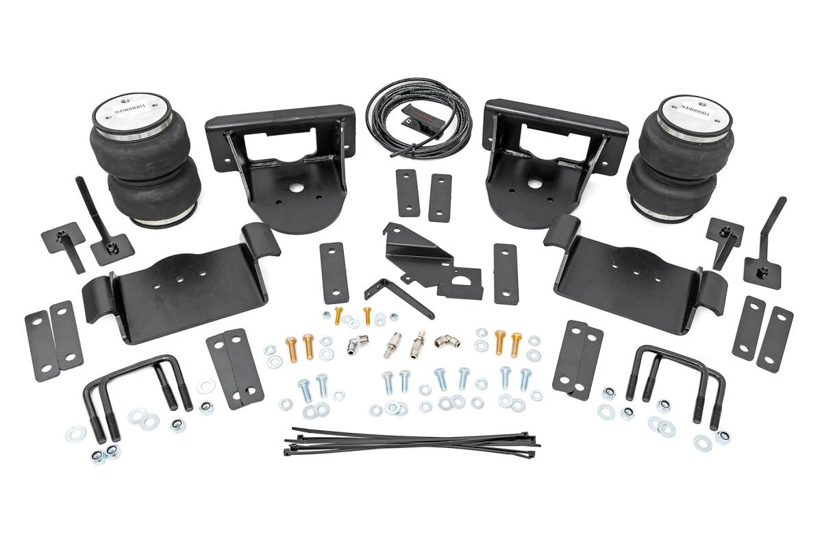 Ideal Leveling: Is your truck your workhorse? The main attraction of a pickup is the ability to haul and tow as needed. However, due to the weight in the bed or the condition of the rear leaf springs, your vehicle may become un-level under load. At Rough Country, we've designed a solution to eliminate these concerns. Introducing Rough Country's Rear Air Spring Kit. Heavy-Duty Construction: Rough Country's Rear Air Spring Kit includes two high-quality, double convoluted air bags, reinforced with durable powder-coated steel brackets and DOT-approved airlines. Whether you're towing a trailer or hauling heavy loads, this kit helps ensure your vehicle remains level, alleviating the strain on your trailer's tongue weight. The kit features 1/4" push-to-connect air fittings for easy installation, along with all necessary bracketry for a secure fit. Rough Country's Air Spring Kit supports up to 5,000 lbs. of load, minimizing sway and preventing bottoming out while braking and steering. Easy Installation: Quick and simple setup for immediate use. Rough Country's kit can be installed at home with standard tools in just 5-6 hours, ensuring minimal downtime and fast, hassle-free installation. Onboard Air Compressor and Wireless Controller: For added convenience, Rough Country offers an optional onboard air compressor and wireless controller to easily adjust your air spring kit on the go. Control air pressure at the push of a button from the comfort of your vehicle. Reliable Warranty Coverage: Rough Country's Rear Air Spring Kit includes a limited lifetime warranty on the air springs and a two-year replacement warranty on the compressor, offering lasting protection against manufacturer defects. This industry-leading coverage ensures confidence in both quality and durability, so you can count on Rough Country to keep your truck performing at its best.
