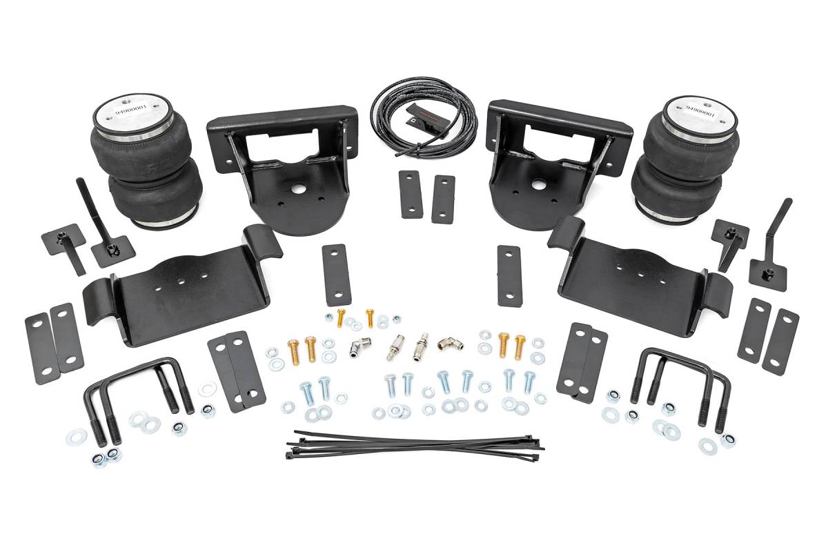 Ideal Leveling: Is your truck your workhorse? The main attraction of a pickup is the ability to haul and tow as needed. However, due to the weight in the bed or the condition of the rear leaf springs, your vehicle may become un-level under load. At Rough Country, we've designed a solution to eliminate these concerns. Introducing Rough Country's Rear Air Spring Kit. Heavy-Duty Construction: Rough Country's Rear Air Spring Kit includes two high-quality, double convoluted air bags, reinforced with durable powder-coated steel brackets and DOT-approved airlines. Whether you're towing a trailer or hauling heavy loads, this kit helps ensure your vehicle remains level, alleviating the strain on your trailer's tongue weight. The kit features 1/4" push-to-connect air fittings for easy installation, along with all necessary bracketry for a secure fit. Rough Country's Air Spring Kit supports up to 5,000 lbs. of load, minimizing sway and preventing bottoming out while braking and steering. Easy Installation: Quick and simple setup for immediate use. Rough Country's kit can be installed at home with standard tools in just 5-6 hours, ensuring minimal downtime and fast, hassle-free installation. Onboard Air Compressor and Wireless Controller: For added convenience, Rough Country offers an optional onboard air compressor and wireless controller to easily adjust your air spring kit on the go. Control air pressure at the push of a button from the comfort of your vehicle. Reliable Warranty Coverage: Rough Country's Rear Air Spring Kit includes a limited lifetime warranty on the air springs and a two-year replacement warranty on the compressor, offering lasting protection against manufacturer defects. This industry-leading coverage ensures confidence in both quality and durability, so you can count on Rough Country to keep your truck performing at its best.