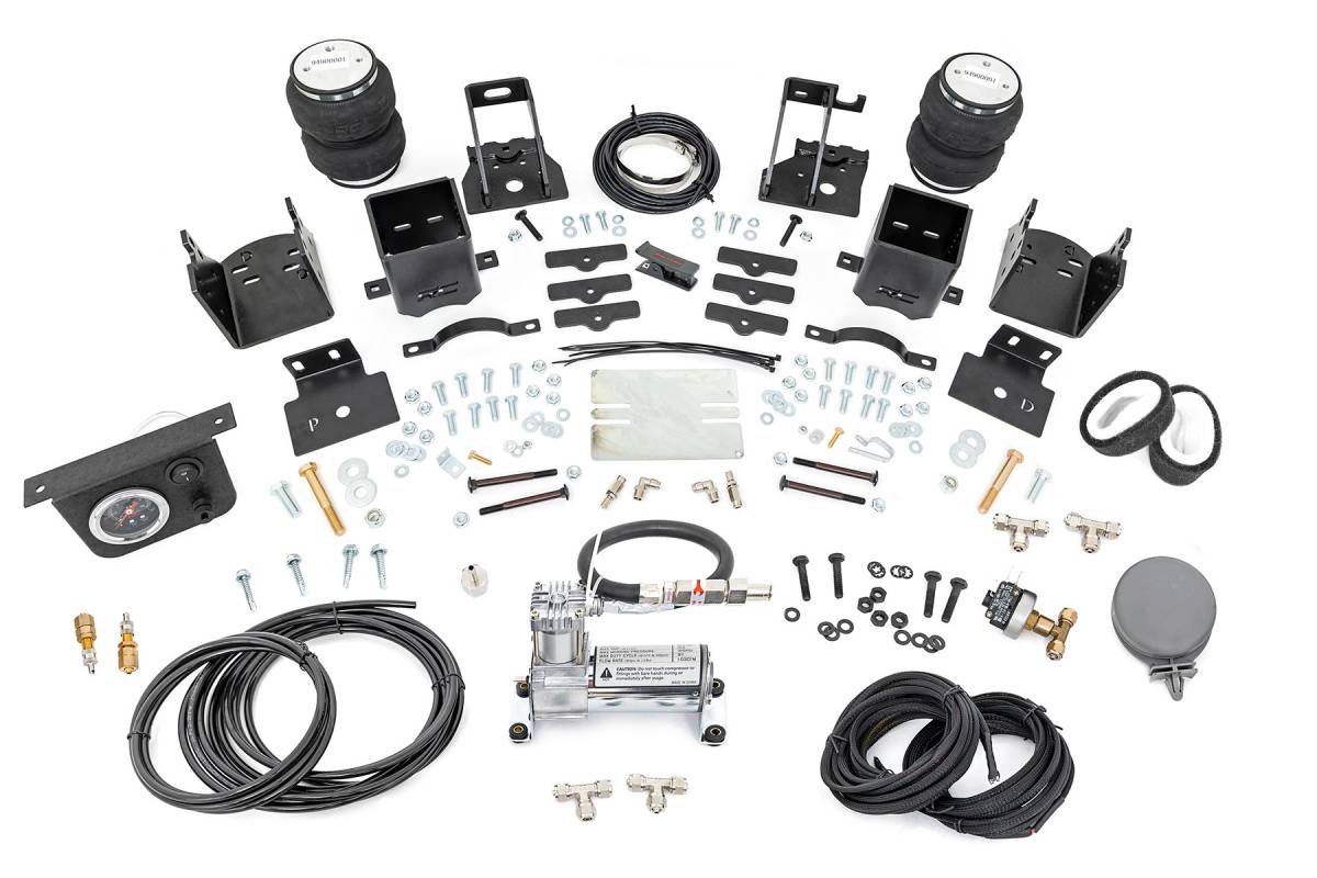 Ideal Leveling: Is your truck your workhorse? The main attraction of a pickup is the ability to haul and tow as needed. However, due to the weight in the bed or the condition of the rear leaf springs, your vehicle may become un-level under load. At Rough Country, we've designed a solution to eliminate these concerns. Introducing Rough Country's Rear Air Spring Kit. Heavy-Duty Construction: Rough Country's Rear Air Spring Kit includes two high-quality, double convoluted air bags, reinforced with durable powder-coated steel brackets and DOT-approved airlines. Whether you're towing a trailer or hauling heavy loads, this kit helps ensure your vehicle remains level, alleviating the strain on your trailer's tongue weight. The kit features 1/4" push-to-connect air fittings for easy installation, along with all necessary bracketry for a secure fit. Rough Country's Air Spring Kit supports up to 5,000 lbs. of load, minimizing sway and preventing bottoming out while braking and steering. Easy Installation: Quick and simple setup for immediate use. Rough Country's kit can be installed at home with standard tools in just 5-6 hours, ensuring minimal downtime and fast, hassle-free installation. Onboard Air Compressor and Wireless Controller: For added convenience, Rough Country offers an optional onboard air compressor and wireless controller to easily adjust your air spring kit on the go. Control air pressure at the push of a button from the comfort of your vehicle. Reliable Warranty Coverage: Rough Country's Rear Air Spring Kit includes a limited lifetime warranty on the air springs and a two-year replacement warranty on the compressor, offering lasting protection against manufacturer defects. This industry-leading coverage ensures confidence in both quality and durability, so you can count on Rough Country to keep your truck performing at its best.