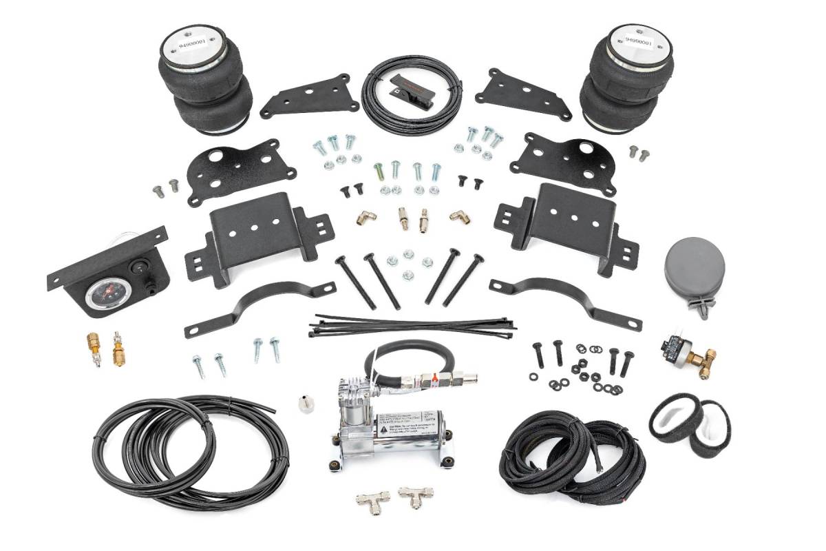 Ideal Leveling: Is your truck your workhorse? The main attraction of a pickup is the ability to haul and tow as needed. However, due to the weight in the bed or the condition of the rear leaf springs, your vehicle may become un-level under load. At Rough Country, we've designed a solution to eliminate these concerns. Introducing Rough Country's Rear Air Spring Kit. Heavy-Duty Construction: Rough Country's Rear Air Spring Kit includes two high-quality, double convoluted air bags, reinforced with durable powder-coated steel brackets and DOT-approved airlines. Whether you're towing a trailer or hauling heavy loads, this kit helps ensure your vehicle remains level, alleviating the strain on your trailer's tongue weight. The kit features 1/4" push-to-connect air fittings for easy installation, along with all necessary bracketry for a secure fit. Rough Country's Air Spring Kit supports up to 5,000 lbs. of load, minimizing sway and preventing bottoming out while braking and steering. Easy Installation: Quick and simple setup for immediate use. Rough Country's kit can be installed at home with standard tools in just 5-6 hours, ensuring minimal downtime and fast, hassle-free installation. Onboard Air Compressor and Wireless Controller: For added convenience, Rough Country offers an optional onboard air compressor and wireless controller to easily adjust your air spring kit on the go. Control air pressure at the push of a button from the comfort of your vehicle. Reliable Warranty Coverage: Rough Country's Rear Air Spring Kit includes a limited lifetime warranty on the air springs and a two-year replacement warranty on the compressor, offering lasting protection against manufacturer defects. This industry-leading coverage ensures confidence in both quality and durability, so you can count on Rough Country to keep your truck performing at its best.