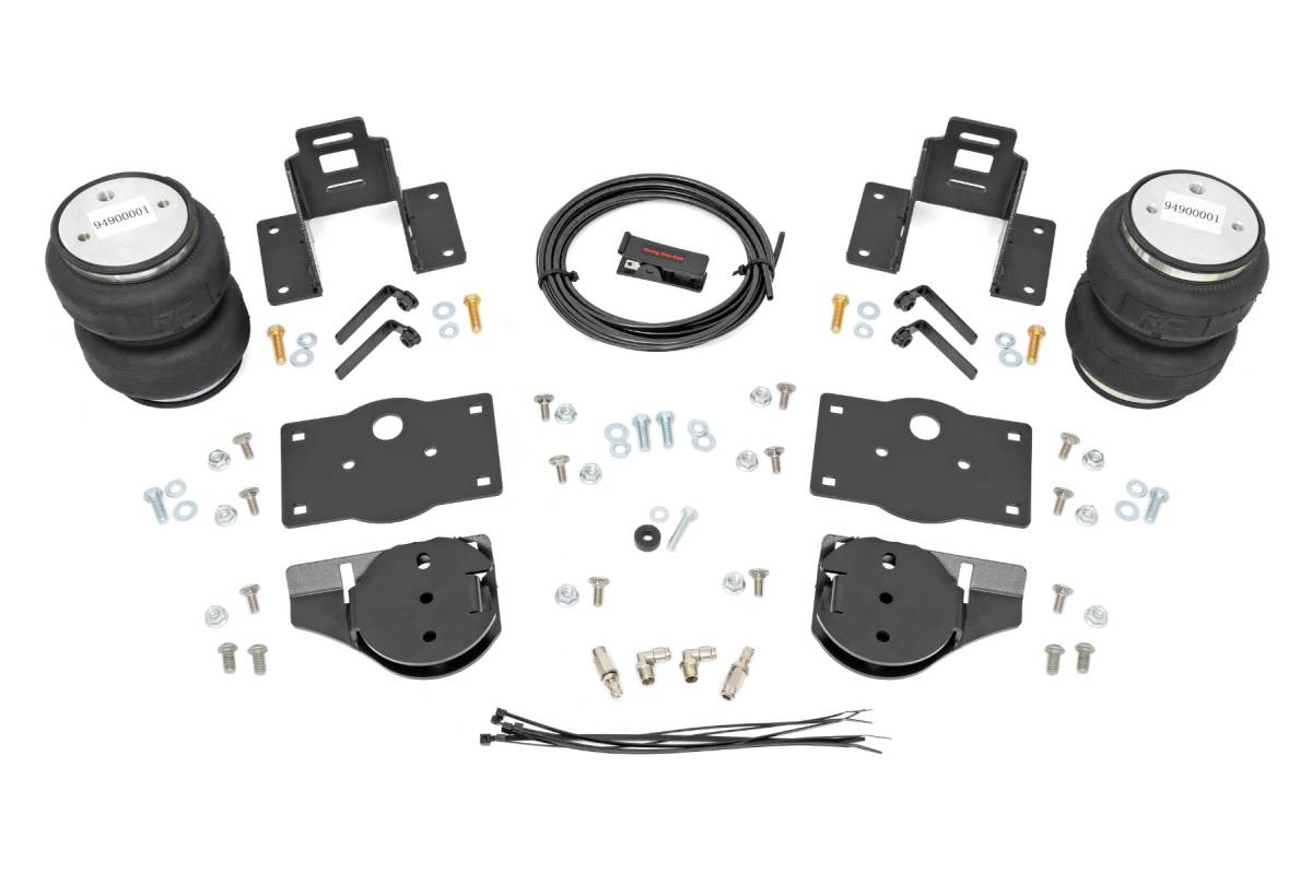 Ideal Leveling. Is your truck your workhorse? The main attraction to the pick-up line is the accessibility to haul and tow as desired. However, due to the amount of weight in the bed, or the condition of the vehicle's rear leaf springs, this can cause the vehicle to be un-level when under load. Here at Rough Country, we created an innovative new product to ensure that these are troubles of the past. Introducing, Rough Country's Rear Air Spring Kit. Heavy-duty Construction. Rough Country's Rear Air Spring Kit features two RC branded high-quality double convoluted airbags complemented with DOT-approved airlines. Whether you plan on towing or hauling in the not-so-distant future Rough Country's Air Spring kit is the must-have accessory to ensure that your trailer is level reducing the weight off of the tongue of your trailer. Each kit offers 1/4" push connector fittings and all of the bracketry needed to ensure installation is lightning fast and secure! Rough Country's Air Spring kit provides up to 5,000 lbs. of load support to ensure that you experience less sway and bottoming out when braking and steering! Installation. With an estimated timeframe of 1-2 hours this full kit can be installed at home using standard tools and can be completed efficiently and quickly! Limited Lifetime Replacement Warranty. Rough Country's Rear Air Spring Kit is backed with a limited-lifetime replacement warranty towards manufacturer defects. As such, the product is protected from structural and workmanship damage after the date of purchase. With our industry-leading warranty give yourself peace of mind when using Rough Country's Suspension products!