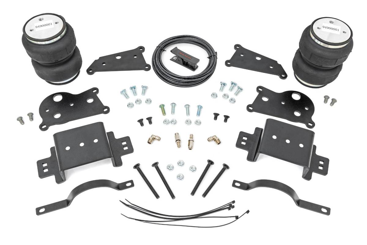 Ideal Leveling. Is your truck your workhorse? The main attraction to the pick-up line is the accessibility to haul and tow as desired. However, due to the amount of weight in the bed, or the condition of the vehicle's rear leaf springs, this can cause the vehicle to be un-level when under load. Here at Rough Country, we created an innovative new product to ensure that these are troubles of the past. Introducing, Rough Country's Rear Air Spring Kit. Heavy-duty Construction. Rough Country's Rear Air Spring Kit features two RC branded high-quality double convoluted airbags complemented with DOT-approved airlines. Whether you plan on towing or hauling in the not-so-distant future Rough Country's Air Spring kit is the must-have accessory to ensure that your trailer is level reducing the weight off of the tongue of your trailer. Each kit offers 1/4" push connector fittings and all of the bracketry needed to ensure installation is lightning fast and secure! Rough Country's Air Spring kit provides up to 5,000 lbs. of load support to ensure that you experience less sway and bottoming out when braking and steering! Installation. With an estimated timeframe of 1-2 hours this full kit can be installed at home using standard tools and can be completed efficiently and quickly! Limited Lifetime Replacement Warranty. Rough Country's Rear Air Spring Kit is backed with a limited-lifetime replacement warranty towards manufacturer defects. As such, the product is protected from structural and workmanship damage after the date of purchase. With our industry-leading warranty give yourself peace of mind when using Rough Country's Suspension products!