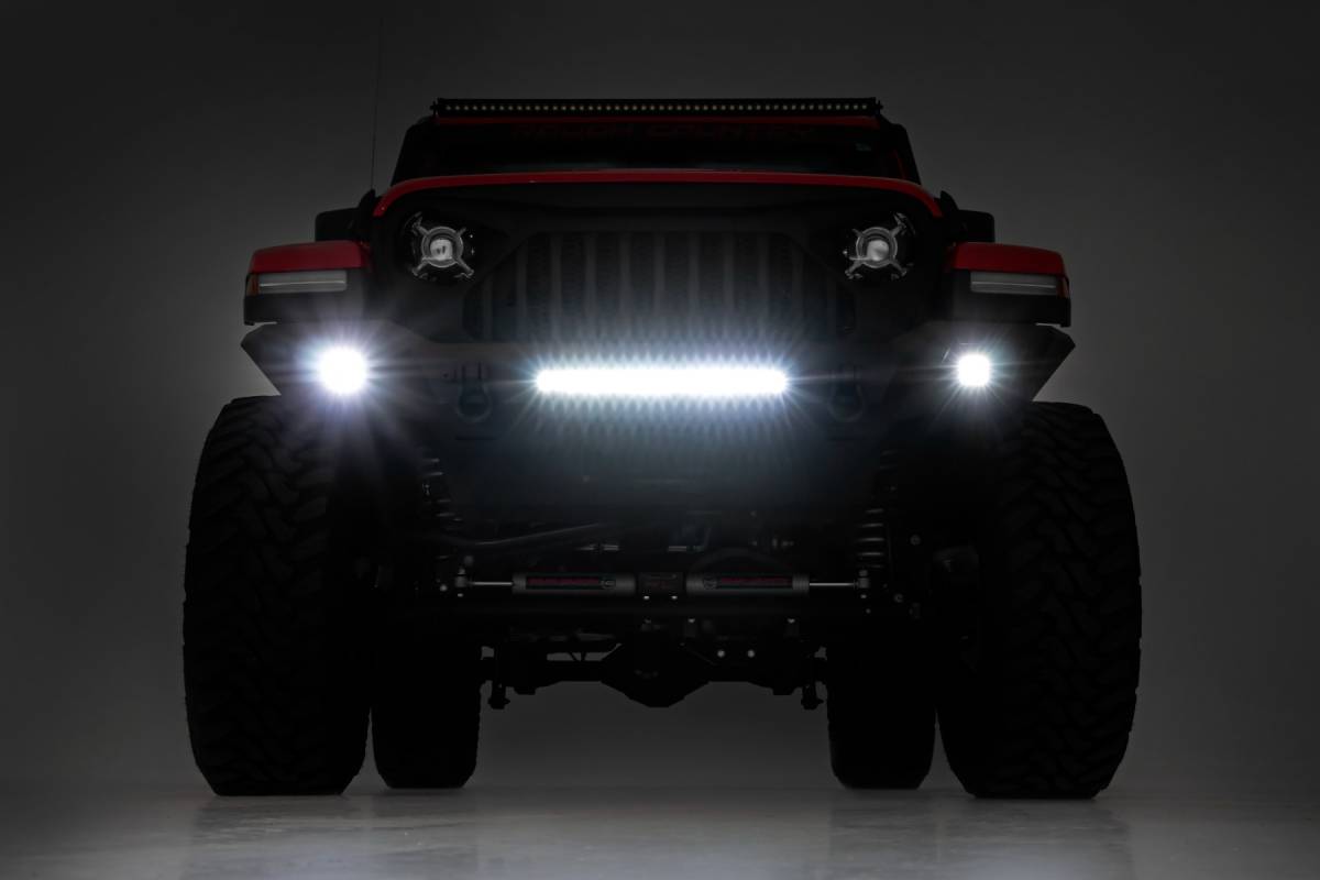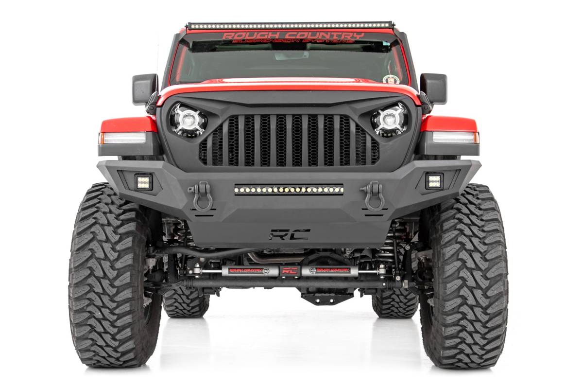 Transform the look and capabilities of your Jeep with Rough Country's Full Width High Clearance Bumper. This full-width version of our fan-favorite Stubby Trail Bumper includes a few extra features you re sure to enjoy! Rough Country's Jeep High Clearance has been engineered with a full-width design that fits in nicely with the factory flare or aftermarket modifications. With Jeep adding turn signals to the factory flares on JL and JT models, a full-width bumper can help lend an aggressive off-road look to your Jeep even when retaining the factory flare. Each kit includes Rough Country 2-inch led cubes producing 2880 lumens and 36 watts of power. This front bumper also features a built-in Rough Country 20in Single-Row Black-Series LED Light Bar, providing 7,200 lumens and 100 watts of forward-facing illumination to help you easily see the trail ahead. Rough Country's Full-Width Bumper also features a set of D-ring shackles for a convenient recovery point, as well as a protective skid plate ensures unbeatable protection in off-road environments. If you re looking for one of the best Jeep bumpers available, look no further!
