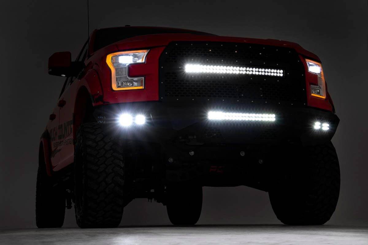 Give the front of your F-150 an aggressive, new appearance with Rough Country's Front LED Bumper. This easy-to-install upgrade gives your truck an improved look and better protection, with a dual set of 2in LED Cubes and a 20in LED Light Bar that offer impressive off-road illumination! Rough Country's Front LED Bumper is made of a durable, all-steel construction that s ready to handle whatever you dish out. Each bumper features four Rough Country Black-Series 2in LED Cubes and a 20in LED Light Bar that offer over 15,000 lumens of combined lighting power. This incredible front bumper system is powder coated flat black and is ready to withstand the elements for a long lifespan of good looks. Rough Country's Rear LED Bumper is also easy to install with no cutting or drilling required! Best of all each bumper includes a 3-year warranty.