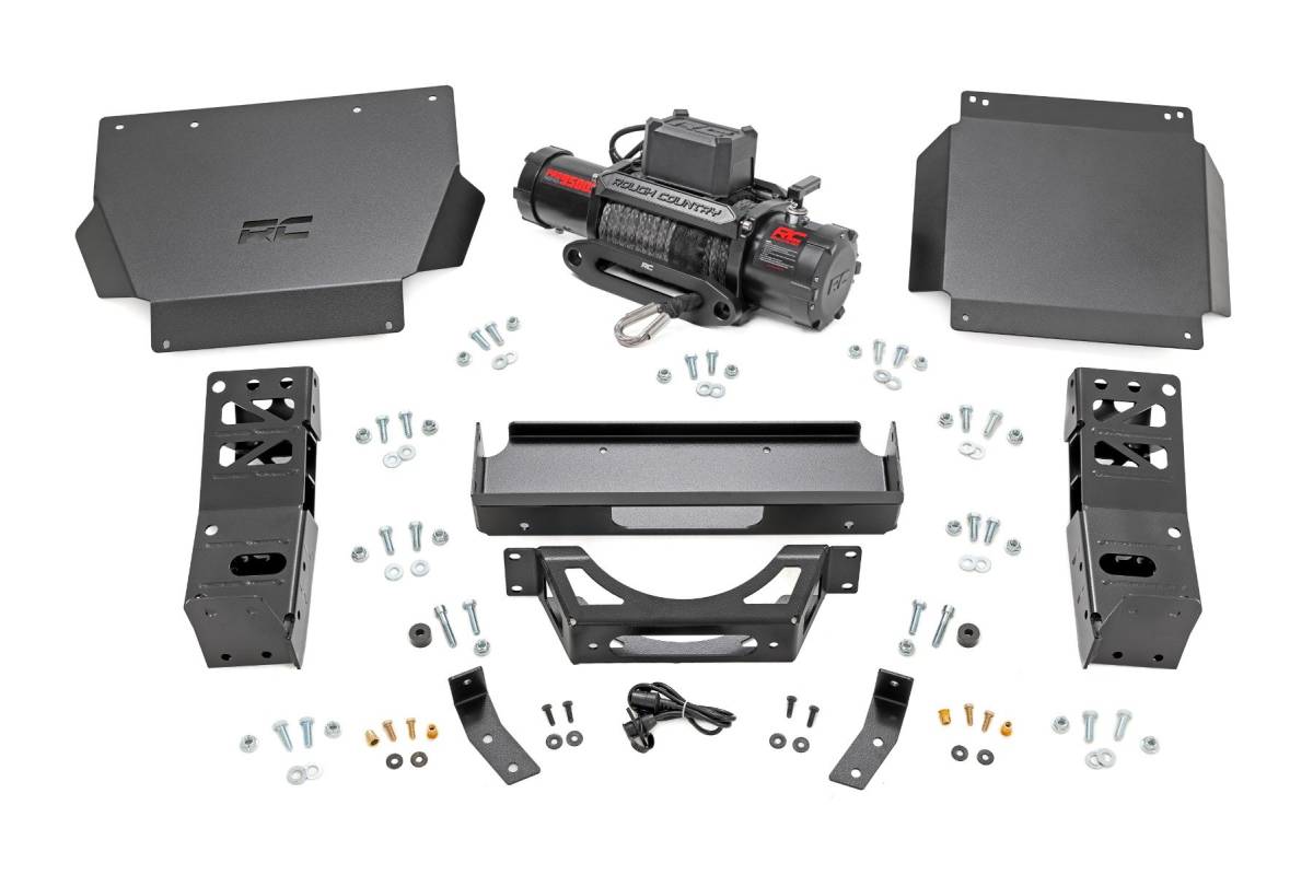 Hidden Strength, Visible Performance: Upgrade your fourth-generation Toyota Tacoma with Rough Country's Hidden Winch Mount Kit, delivering discreet power, rugged durability, and a clean, factory-style finish. Perfect for off-road recovery without compromising style. Stealthy Winch Integration: Designed for Rough Country's PRO9500S and PRO12000S winches, this hidden mount tucks recovery power behind the front fascia, creating a streamlined, low-profile appearance. Maximum Protection: The included differential skid plate shields vital drivetrain components, giving you confidence on rugged trails. The front skid plate also features a laser-cut Rough Country logo for a signature touch of style. Heavy-Duty Construction: Built for extreme durability, the 7-gauge steel winch tray and mounts provide rock-solid support, while 11-gauge steel skid plates offer reinforced undercarriage protection against tough terrain. OEM-Style Front Fascia Included: A new front fascia replaces the factory unit, maintaining a clean, seamless look while concealing the winch system without compromising your Tacoma's refined design. Engineered with an integrated fairlead opening, this fascia eliminates the need for any external cosmetic cutting or trimming, delivering a factory-quality appearance with built-in provision for proper fairlead installation. Effortless Installation: Hit the trails sooner with a bolt-on structural design that makes installation quick and hassle-free. Bumper wing supports mount directly to factory intrusion bars for a secure, factory-like fit. Trail-Ready Performance: Rough Country's Hidden Winch Mount Kit for the Toyota Tacoma combines stealth, strength, and functionality in one low-profile package, giving your truck the ultimate off-road capability.