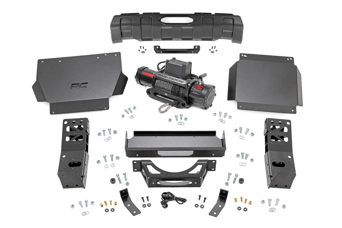 Hidden Strength, Visible Performance: Upgrade your fourth-generation Toyota Tacoma with Rough Country's Hidden Winch Mount Kit, delivering discreet power, rugged durability, and a clean, factory-style finish. Perfect for off-road recovery without compromising style. Stealthy Winch Integration: Designed for Rough Country's PRO9500S and PRO12000S winches, this hidden mount tucks recovery power behind the front fascia, creating a streamlined, low-profile appearance. Maximum Protection: The included differential skid plate shields vital drivetrain components, giving you confidence on rugged trails. The front skid plate also features a laser-cut Rough Country logo for a signature touch of style. Heavy-Duty Construction: Built for extreme durability, the 7-gauge steel winch tray and mounts provide rock-solid support, while 11-gauge steel skid plates offer reinforced undercarriage protection against tough terrain. OEM-Style Front Fascia Included: A new front fascia replaces the factory unit, maintaining a clean, seamless look while concealing the winch system without compromising your Tacoma's refined design. Engineered with an integrated fairlead opening, this fascia eliminates the need for any external cosmetic cutting or trimming, delivering a factory-quality appearance with built-in provision for proper fairlead installation. Effortless Installation: Hit the trails sooner with a bolt-on structural design that makes installation quick and hassle-free. Bumper wing supports mount directly to factory intrusion bars for a secure, factory-like fit. Trail-Ready Performance: Rough Country's Hidden Winch Mount Kit for the Toyota Tacoma combines stealth, strength, and functionality in one low-profile package, giving your truck the ultimate off-road capability.
