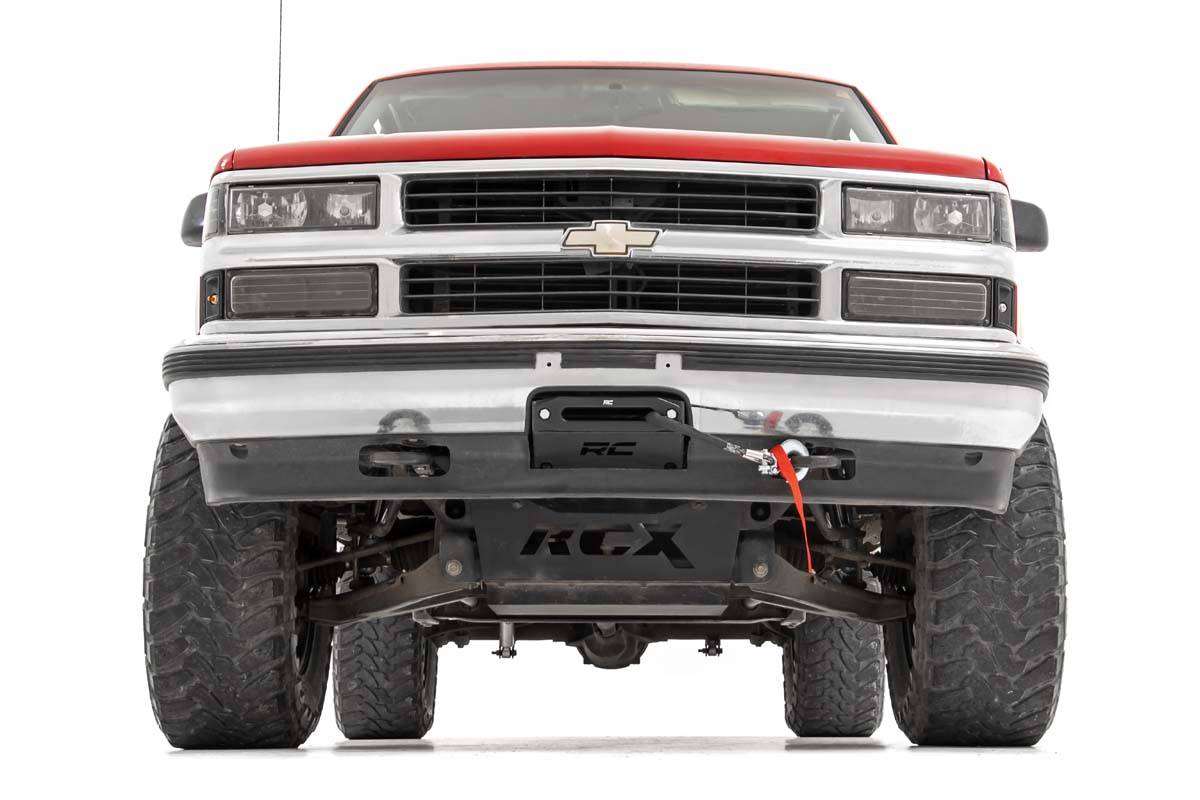 Give your truck a sleek recovery system that still turns heads with Rough Country's Hidden Winch Mount for 88-98 Chevy/GMC 1500 models. This subtle yet innovative design capitalizes on the ample space behind the front bumper to mount your RC PRO series or other standard sized winch while keeping everything neat and tidy. A durable 1/4" plate steel winch mount secures onto the frame for unyielding strength and rigidity suitable for a robust recovery solution. Rough Country's 88-98 GM Hidden Winch Kit installs directly into the factory bumper giving a striking visual appearance that lends to the overall look of your truck. The durable, steel winch plate features a laser-cut "RC" logo and can accommodate either a hawse or roller fairlead. Includes a lifetime replacement guarantee!