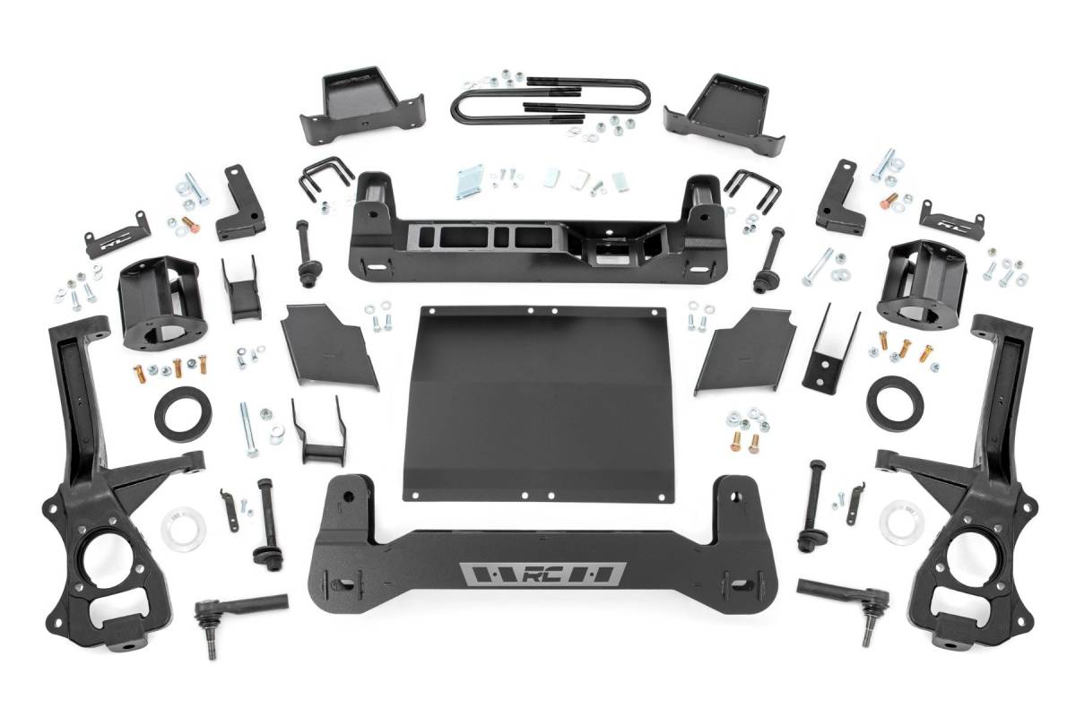 This combined setup provides enough clearance to run 35" tires without additional modifications. We didn't want to limit you to one standard kit. Rough Country's 6-inch kit is configurable with all the shock options that we offer. This allows you to choose which shock series you want! Ranging from our nitrogen-charged N3 shocks to our Vertex reservoir shocks the power to choose is in your hands. Installation: With minor cutting and a strut compressor required to install, an estimated timeframe of 8-10 hours is recommended to complete this full installation. This full kit can be installed at home and can be completed efficiently and quickly! Limited Lifetime Replacement Warranty: Rough Country's 6" Suspension Lift Kit is backed with a limited lifetime replacement warranty towards manufacturer defects. As such, the product is protected from structural and workmanship damage after the date of purchase. With our industry-leading warranty give yourself peace of mind when using Rough Country's Suspension products! Explore New Heights: Transform your truck with Rough Country's 6-inch Suspension Lift, perfectly designed to enhance the bold, aggressive styling of GM s all-new fourth-generation Sierra 1500 Denali and Silverado 1500 High Country. These models, already equipped with GM s adaptive ride control package, are taken to the next level with Rough Country's lift kit giving your vehicle a commanding presence on and off the road. Whether you're tackling tough trails or cruising through city streets, the Rough Country 6-inch Lift ensures improved performance and head-turning appeal. Innovative Design and Construction: When changing a vehicle's suspension, the key to preserving ride quality is keeping the geometry of all suspension components as close to their factory angles as possible. This suspension kit combines the use of durable steel knuckles, differential brackets, and drop cross members to reduce cv angles and simulate factory angles all while achieving new heights. Featuring a set of upper strut spacers that offer uncompromised strength and rigidity, gaining lift height is no issue. Completing the rear of this suspension kit is a set of rear blocks, shocks, and U-bolts that allow you to retain factory-like geometry.