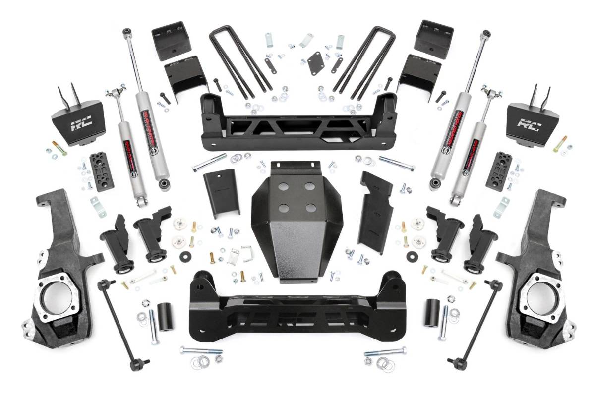 Ultimate Upgrade. Give your GM 2500HD/3500HD an unbeatable stance and better ride quality with Rough Country's 5-inch Lift Kit with Torsion Drop. This kit is a unique offering of suspension lifts, delivering the desired torsion drop look and ride you want while still offering unmatched ground clearance. The Torsion Drop brackets are designed to ensure that your vehicle's track width is not widened and allows you to maintain the factory feel of handling corners and turns. So take your everyday ride and make it one of a kind with our 5-inch Lift Kit with Torsion Drop! Premium Construction. This 5-Inch rugged lift kit is made of heavy-duty laser-cut steel components, powder-coated for a long-lasting finish. It includes replacement knuckles, 1/4" thick steel cross members for the front and rear, fabricated lift blocks, and 1/4" thick Torsion Drop Bar Brackets. You also get the option to configure with multiple shock options that we offer. This allows you to choose the shock series that best fits your needs! Ranging from our nitrogen-charged N3 shocks, to V2 monotube shocks, or our high-performance Vertex adjustable shocks, the power to choose is in your hands. This setup will give you a level stance and the ride height you need to run those larger tires with ease. Installation and Warranty. This kit is packed with all hardware needed for installation and includes full sway bar links, a durable, thick Skid Plate, and brake line relocation brackets. Although some minor cutting and drilling are required, there is no drilling or modifying of the differential, and no drivetrain or exhaust modifications are required. Rough Country's products are backed with a limited lifetime replacement warranty. This means that you have the security of knowing that Rough Country's products will work as they should, even after years of use.