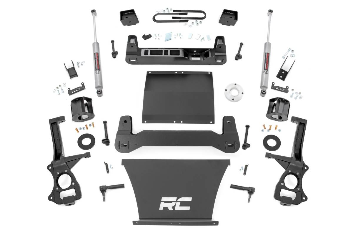 Explore New Heights: GMC's fourth-generation Sierra 1500 features an impressive all-new design that's built from the ground up, with aggressive angles and head-turning stylings that fit in beautifully when transformed with Rough Country's 6-inch Suspension Lift. Innovative Design and Construction: When changing a vehicle's suspension, the key to preserving ride quality is keeping the geometry of all suspension components as close to their factory angles as possible. This suspension kit combines the use of durable steel knuckles and drop cross members to reduce control arm angles and simulate factory angles all while achieving new heights. Featuring a set of upper strut spacers that offer uncompromised strength and rigidity, gaining lift height is no issue. Completing the rear of this suspension kit is a set of rear blocks, shocks, and U-bolts that allow you to retain factory-like geometry. This combined setup provides enough clearance to run 35" tires without additional modifications. We didn't want to limit you to one standard kit. Rough Country's 6-inch kit is configurable with all the shock options that we offer. This allows you to choose which shock series you want! Ranging from our nitrogen-charged N3 shocks to our Vertex reservoir shocks the power to choose is in your hands. Installation: With minor cutting and a strut compressor required to install, an estimated timeframe of 8-10 hours is recommended to complete this full installation. This full kit can be installed at home and can be completed efficiently and quickly! Limited Lifetime Replacement Warranty: Rough Country's 6" Suspension Lift Kit is backed with a limited lifetime replacement warranty towards manufacturer defects. As such, the product is protected from structural and workmanship damage after the date of purchase. With our industry-leading warranty give yourself peace of mind when using Rough Country's Suspension products!