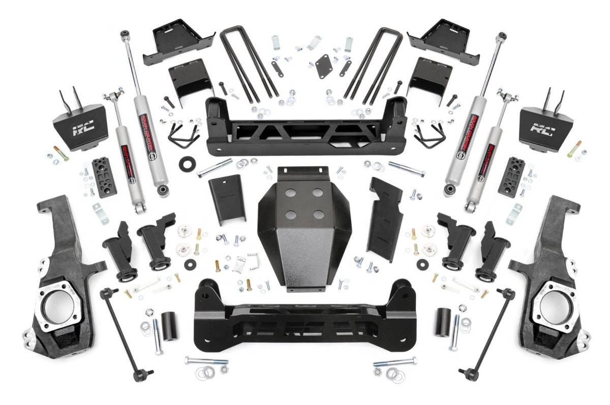 Ultimate Upgrade. Give your GM 2500HD/3500HD an unbeatable stance and better ride quality with Rough Country's 7-inch Lift Kit with Torsion Drop. This kit is a unique offering of suspension lifts, delivering the desired torsion drop look and ride you want while still offering unmatched ground clearance. The Torsion Drop brackets are designed to ensure that your vehicle's track width is not widened and allows you to maintain the factory feel of handling corners and turns. So take your everyday ride and make it one of a kind with our 7-inch Lift Kit with Torsion Drop! Premium Construction. This 7-Inch rugged lift kit is made of heavy-duty laser-cut steel components, powder-coated for a long-lasting finish. It includes replacement knuckles, 1/4" thick steel cross members for the front and rear, fabricated lift blocks, and 1/4" thick Torsion Drop Bar Brackets. You also get the option to configure with multiple shock options that we offer. This allows you to choose the shock series that best fits your needs! Ranging from our nitrogen-charged N3 shocks, to V2 monotube shocks, or our high-performance Vertex adjustable shocks, the power to choose is in your hands. This setup will give you a level stance and the ride height you need to run those larger tires with ease. Installation and Warranty. This kit is packed with all hardware needed for installation and includes full sway bar links, a durable, thick Skid Plate, and brake line relocation brackets. Although some minor cutting and drilling are required, there is no drilling or modifying of the differential, and no drivetrain or exhaust modifications are required. Rough Country's products are backed with a limited lifetime replacement warranty. This means that you have the security of knowing that Rough Country's products will work as they should, even after years of use.
