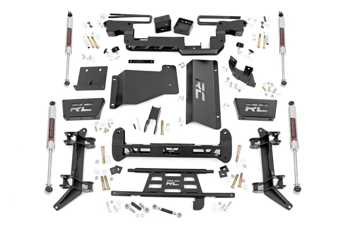 Take your truck to the next level with Rough Country's 6in Lift Kit for 1988-2000 GM 2500 Pickups! This all-inclusive kit has everything you need for a total transformation. Designed to elevate your ride and give you serious off-road capabilities, this kit boosts your Truck's ground clearance, allowing you to run up to 35x12.50 tires!Retains stock track width: Maintains your truck's factory track width for optimal handling and stability, giving you a smooth, controlled driving experience both on and off the road.Increased ground clearance: Boost your ground clearance for superior off-road capability and obstacle clearance, helping you navigate tough trails with ease.Fabricated blocks: Stronger & longer lifespan: Featuring high-strength fabricated blocks, this kit offers enhanced durability compared to cast alternatives, ensuring long-lasting performance and reliability.RC laser cut logos: Torsion bar drop brackets & front skid plate come with custom RC laser-cut logos for added style and branding because your truck should look as tough as it performs. Configurable Shock Options: Choose from N3, V2 Monotube, or M1 Monotube shocks tailor your ride's performance to your exact needs, whether you're cruising the highway or conquering the toughest trails. Rough Country 6in Lift Kit for 88-98 GM 2500 Pickups is the perfect upgrade for anyone seeking power, performance, and style. With enhanced ground clearance, rugged durability, and customizable shock options, this kit will transform your truck into an unstoppable off-road machine.