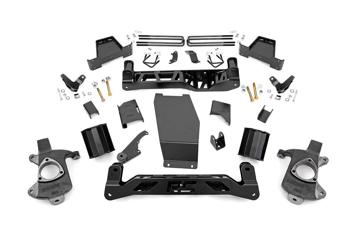 Get the look you really want with Rough Country's 6-inch Suspension Kit for GMC Sierra Denali 1500 Pickups equipped with Magnetic Ride Control. This massive kit affords your truck the ability to run 33-inch tires on factory wheels with our beefy lifted knuckles and is designed with 100% laser-cut materials for the best possible fit on your vehicle. Includes a set of front and rear high-clearance crossmembers featuring the "RC" logo and a differential skid-plate. Each kit also comes with a set of durable, fabricated lift blocks that are stronger and offer a longer lifespan than cast blocks. Give your pickup an aggressive, lifted and level stance with incredible ride quality! Our innovative Lifted Knuckle design boosts ride height while keeping all components at the optimum angles for a factory-like ride. Includes Rough Country's Lifetime Replacement Warranty.