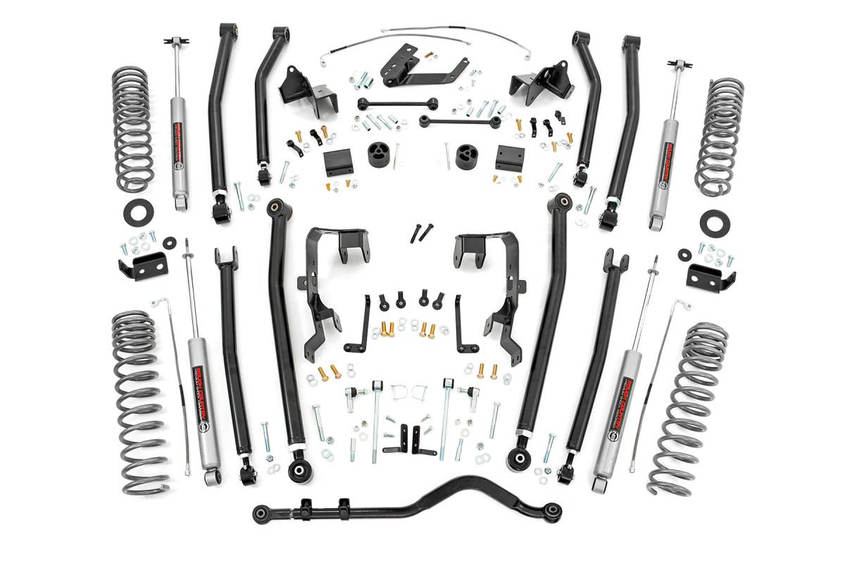 Unleash Your Jeep Full Potential: Rough Country's 4-Inch Long Arm Suspension Lift Kit delivers the ultimate balance of off-road articulation and smooth highway comfort. This true 4-link setup is engineered for maximum axle flex while maintaining optimal suspension geometry - giving you jaw-dropping crawling capabilities without sacrificing the daily drivability you expect. Engineered for Peak Performance: This system features custom-tuned dual-rate coil springs for a smooth, controlled ride across rugged terrain and pavement alike. Whether you're climbing rocks or cruising the highway, you'll enjoy the perfect blend of performance and comfort. Premium N3 Shock Absorbers Included: Each kit comes with Rough Country's nitrogen-charged N3 shocks, offering unmatched ride quality and extended travel to conquer any obstacle in your path. Fully Adjustable 4-Link Setup: Gain total control over your suspension geometry with adjustable front and rear upper and lower control arms. These arms are built from heavy-wall DOM tubing and feature Rough Country's advanced X-Flex joints - complete with durable OEM-style rubber bushings, fully rebuildable flex joints, a massive 2.5" diameter body with 1.25" threads, and a fully greaseable design for long-lasting strength and performance. Built Tough from the Ground Up: All brackets are constructed from high-tensile strength 1/4-inch steel plate, ensuring rock-solid durability and reliability on the trail. Simplified Installation: No welding, no factory crossmember removal - just a straightforward install made even easier with extended stainless steel brake lines and coil correction plates that correct rear coil spring angles by 10 degrees for optimal performance.