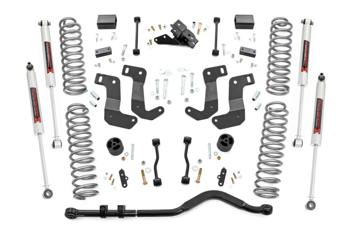 With its massive 1.25-inch outside diameter and rugged OEM-style rubber bushings, it's built to handle anything the off-road throws its way. Easy Installation: We know you'd rather be off-roading than in the garage all day. That's why our lift kit is designed for easy installation, so you can hit the trails in no time. At Rough Country, we understand that no two off-road journeys are the same. That's why our 3.5-inch kit is fully adaptable, allowing you to select your preferred shock series, be it the nitrogen-charged N3 shocks, high-performance M1R Monotube shocks, precision-tuned M1 Monotube shocks, or our premium V2 Monotube shocks. With Rough Country, you're not just upgrading your Jeep you're defining your off-road legacy. When it comes to your 4-door Jeep JL, we know you need a lift that won't let you down. Our 3.5 Inch Lift Kit delivers legendary off-road prowess and smooth on-road handling. Increased Ground Clearance: Get ready to conquer those rocky trails and rough terrains like a boss! Our lift kit gives your Jeep Wrangler Unlimited the extra inches it needs to clear obstacles with ease. Front-to-Rear Leveling: Tired of that nose-down stance? Ditch the unbalanced Jeep life with our leveling kit. We bring symmetry to your ride, lifting the front to match the rear, giving you a smooth and steady journey. Tuned Coil Springs for Superior Performance: Your Jeep's handling and ride quality matter, and we get that. Our coil springs come dialed in with OEM spring rates, delivering top-notch handling and a plush ride. Our linear coil rate springs take it up a notch, ensuring impeccable handling and stability, even when the terrain gets wild. Additional Tire Clearance: Who doesn't want bigger, beefier tires? Our lift kit makes room for larger tires (up to 35 inches), giving your Jeep a more aggressive look that will turn heads on and off the road! Heavy-duty Track Bar: Our included track bar is an absolute beast, constructed from forged solid steel for unparalleled strength and durability.
