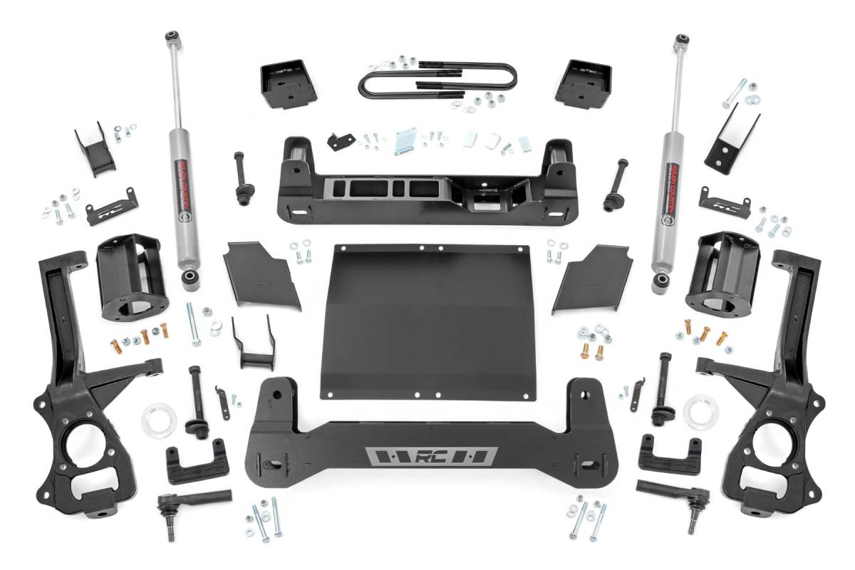 Explore New Heights: Chevy's fourth generation 1500 features an impressive all-new design that's built from the ground up, with aggressive angles and head-turning stylings that fit in beautifully when transformed with Rough Country's 6-inch Suspension Lift. Innovative Design and Construction: When changing a vehicle's suspension, the key to preserving ride quality is keeping the geometry of all suspension components as close to their factory angles as possible. This suspension kit combines the use of durable steel knuckles, differential brackets, and drop cross members to reduce cv angles and simulate factory angles all while achieving new heights. Featuring a set of upper strut spacers that offer uncompromised strength and rigidity, gaining lift height is no issue. Completing the rear of this suspension kit is a set of rear blocks, shocks, and U-bolts that allow you to retain factory-like geometry. This combined setup provides enough clearance to run 35" tires without additional modifications. We didn't want to limit you to one standard kit. Rough Country's 6-inch kit is configurable with all the shock options that we offer. This allows you to choose which shock series you want! Ranging from our nitrogen-charged N3 shocks to our Vertex reservoir shocks the power to choose is in your hands. Installation: With minor cutting and a strut compressor required to install, an estimated timeframe of 8-10 hours is recommended to complete this full installation. This full kit can be installed at home and can be completed efficiently and quickly! Limited Lifetime Replacement Warranty: Rough Country's 6" Suspension Lift Kit is backed with a limited lifetime replacement warranty towards manufacturer defects. As such, the product is protected from structural and workmanship damage after the date of purchase. With our industry-leading warranty give yourself peace of mind when using Rough Country's Suspension products!