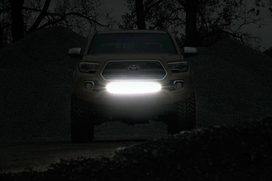 Give your Tacoma the power of off-road illumination with Rough Country's 30-inch Hidden Bumper LED Kit. This all-inclusive lighting kit fits perfectly into the factory opening on 2016+ Toyota Tacoma bumpers, housing a 30-inch LED Light bar for impressive lighting power. This kit includes Rough Country's popular 30" Single-Row CREE LED Light Bar, featuring a powerful 12,000 Lumen, 150-Watt output. The durable die-cast aluminum housing offers incredible protection while the IP67 Waterproof design wards off mud, water, and dust. The included mounts provide a clean, flush look that blends in so well you ll never see a Tacoma bumper the same way! It s the perfect position for extra lighting that you ll find handy time and time again. Includes Rough Country's 3-Year LED Warranty and a Lifetime Warranty on the mounting system.