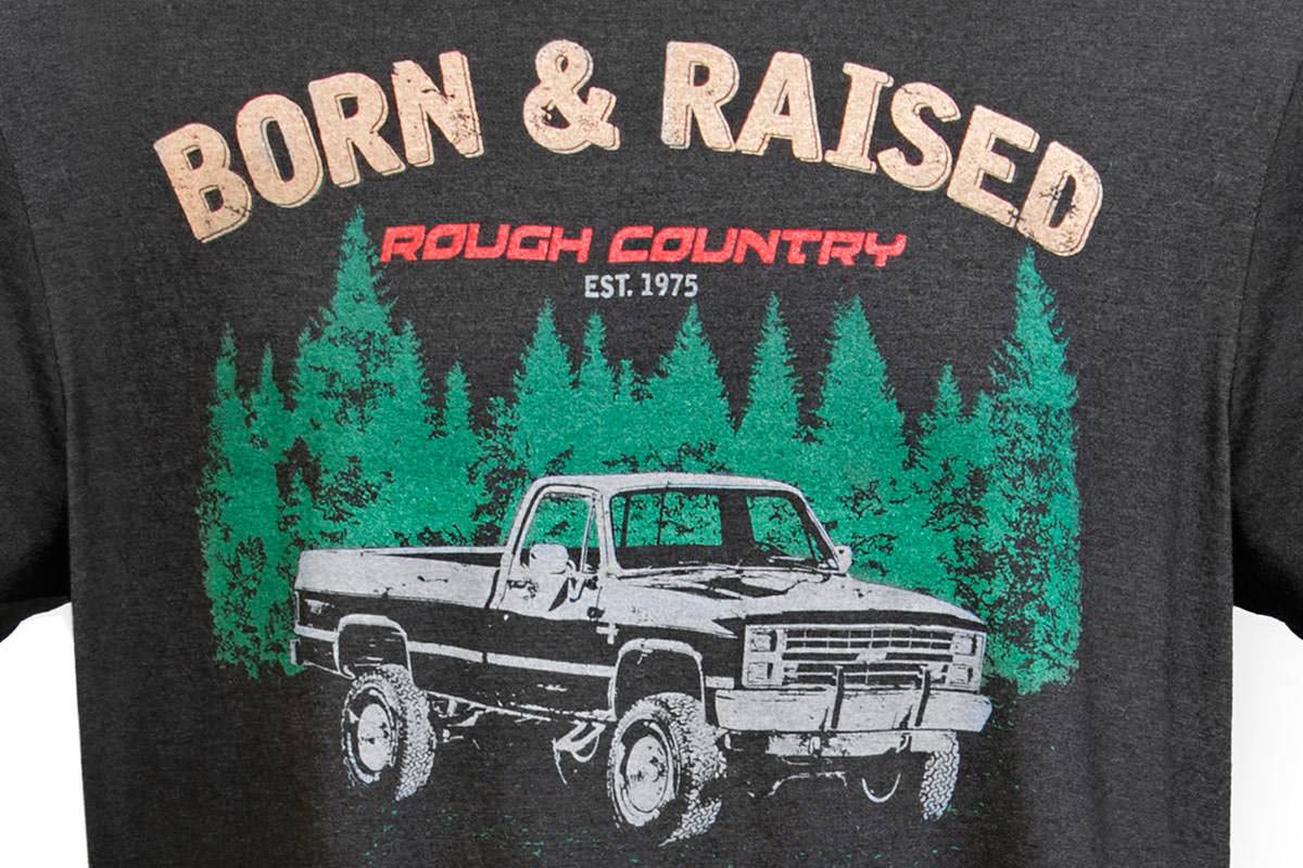 It s not a fad, it s a way of life! Let everyone know how deep your roots run with Rough Country's GBorn & Raised" T-shirt, featuring a square-body chevy among a backdrop of rustic, country trees. This t-shirt features a stylish and comfortable heather fabric style for exceptional good looks and a long lifespan. This tri-blend tee includes a tagless design for a more comfortable feel.