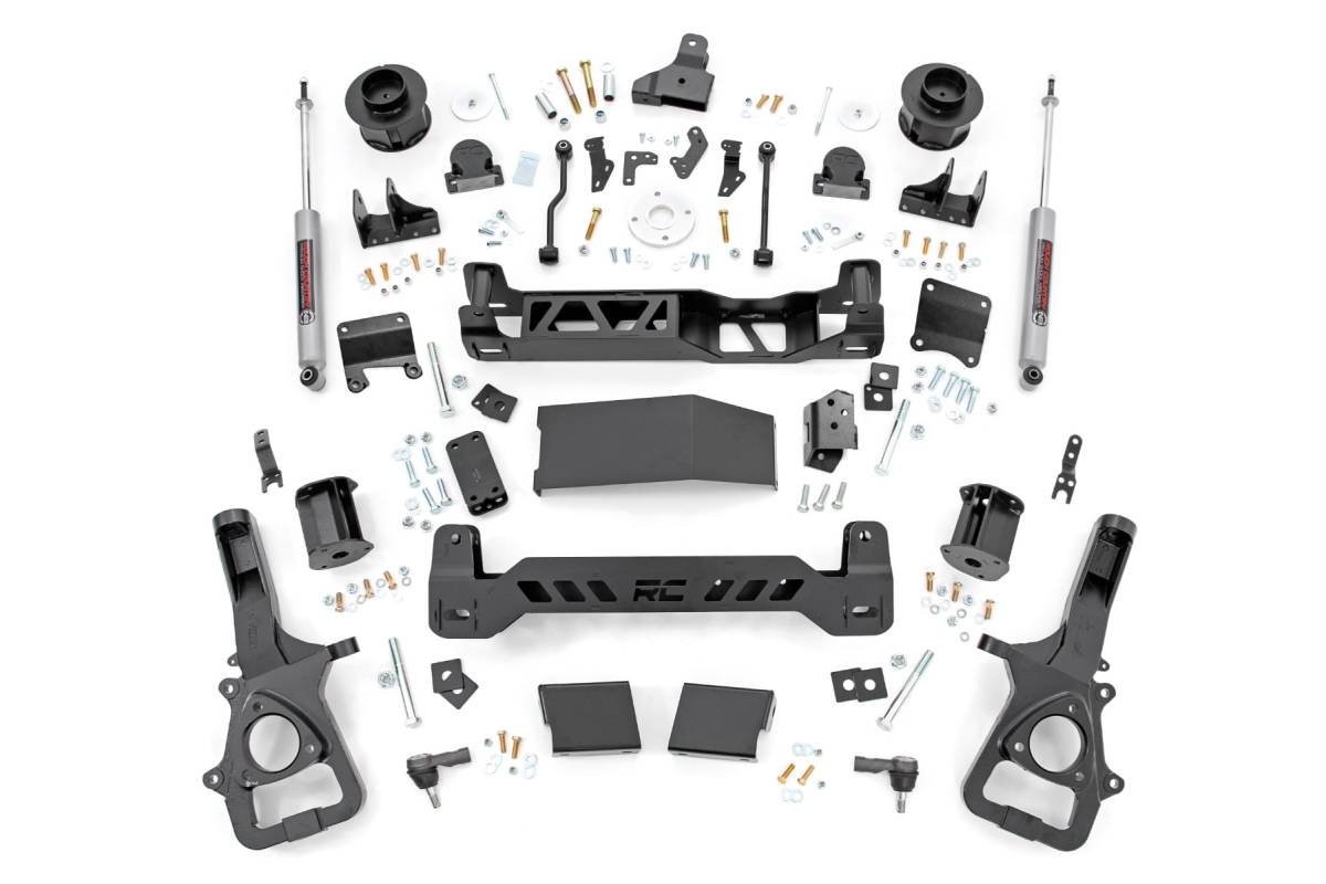 Explore New Heights. Ram's updated fifth generation 1500 features an impressive all-new design that's built from the ground up, with aggressive angles and head-turning stylings that fit in beautifully when transformed with Rough Country's 6-inch Suspension Lift. Innovative Design and Construction. When changing a vehicle's suspension, the key to preserving ride quality is keeping the geometry of all suspension components as close to their factory angles as possible. This suspension kit combines the use of durable steel knuckles, differential brackets, and drop cross members to reduce cv angles and simulate factory angles all while achieving new heights. Featuring a set of upper strut spacers that offer uncompromised strength and rigidity, gaining lift height is no issue. Completing the rear of this suspension kit is a set of rear coil spacers, track bar relocation bracket, and sway bar links that allow you to retain factory-like geometry. This combined setup provides enough clearance to run 35" tires without additional modifications. Installation. With minor cutting and a strut compressor required to install, an estimated timeframe of 7-8 hours is recommended to complete this full installation. This full kit can be installed at home and can be completed efficiently and quickly! Limited Lifetime Replacement Warranty. Rough Country's 6" Suspension Lift Kit is backed with a limited lifetime replacement warranty towards manufacturer defects. As such, the product is protected from structural and workmanship damage after the date of purchase. With our industry-leading warranty give yourself peace of mind when using Rough Country's Suspension products!