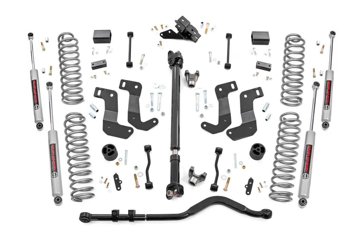 When it comes to your two-door Jeep JL, we know you need a lift that won't let you down. Our 3.5 Inch Lift Kit delivers legendary off-road prowess and smooth on-road handling. Increased Ground Clearance: Get ready to conquer those rocky trails and rough terrains like a boss! Our lift kit gives your Jeep Wrangler Rubicon the extra inches it needs to clear obstacles with ease. Front-to-Rear Leveling: Tired of that nose-down stance? Ditch the unbalanced Jeep life with our leveling kit. We bring symmetry to your ride, lifting the front to match the rear, giving you a smooth and steady journey. Tuned Coil Springs for Superior Performance: Your Jeep's handling and ride quality matter, and we get that. Our coil springs come dialed in with OEM spring rates, delivering top-notch handling and a plush ride. Our linear coil rate springs take it up a notch, ensuring impeccable handling and stability, even when the terrain gets wild. Additional Tire Clearance: Who doesn't want bigger, beefier tires? Our lift kit makes room for larger tires (up to 35 inches), giving your Jeep a more aggressive look that will turn heads on and off the road! Heavy-duty Track Bar: Our included track bar is an absolute beast, constructed from forged solid steel for unparalleled strength and durability. With its massive 1.25-inch outside diameter and rugged OEM-style rubber bushings, it's built to handle anything the off-road throws its way. Durable CV Driveshaft: The factory shaft does not have adequate clearance once lifted and will cause damage to the Rzeppa joint if the driveshaft spins while the suspension is fully flexed or articulated. Rough Country's extended Front CV Driveshaft eliminates this issue allowing you to flex your suspension with more peace of mind! Easy Installation: We know you'd rather be off-roading than in the garage all day. That's why our lift kit is designed for easy installation, so you can hit the trails in no time.