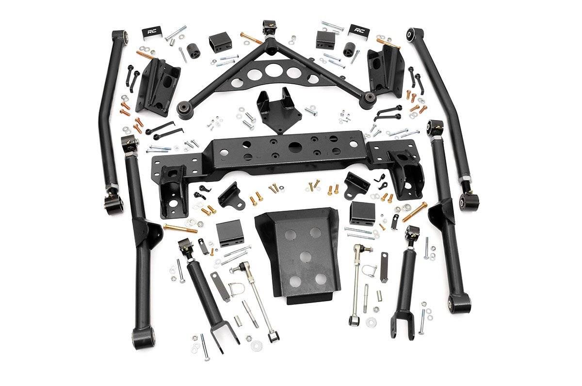 The long awaited WJ 4-inch Longarm Upgrade Kit is a comprehensive package including everything needed for a great suspension upgrade while maintaining the vehicle's crucial center of gravity. The kit includes adjustable high-clearance X-Flex upper and lower control arms with durable rubber bushings, featuringX-Flex joints. The kit also includes 1/4-inch thick steel crossmember, skid plate and sway bar disconnects. This Longarm Upgrade Kit is a total solution comprised of top-notch components designed for the avid off-roader who wants the most out of their WJ. This top of the line kit focuses on improving off-road handling and articulation while preventing binding and rear steer. This kit features high-clearance components with a front 4-link and rear y-link control arm design. This promotes extreme flex while keeping pinion angles optimized. Utilizing adjustable components, this kit can also accommodate future modifications.