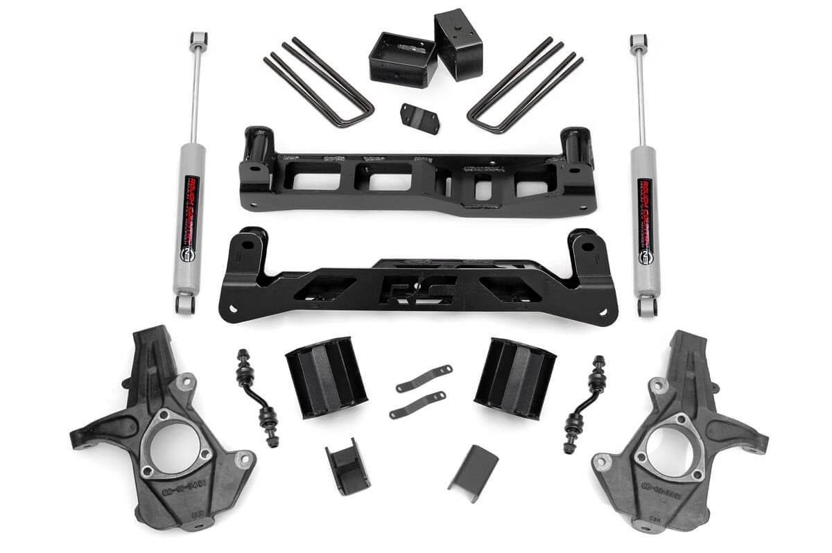 Aggressive Lift, OEM Compatibility: Transform your 2WD Chevy/GMC 1500 with Rough Country's 5-Inch Lift Kit, delivering a head-turning, aggressive profile while maintaining OEM compatibility. This system lets you run 33-inch tires on factory 18 or 20-inch wheels-no extra modifications needed. The result? A leveled, front-to-rear stance that boosts both curb appeal and on-road confidence. Engineered for Performance and Clearance: Designed with a high-clearance crossmember and heavy-duty fabricated blocks, this kit is built for superior off-road capability and long-term durability. The precision laser-cut components ensure a perfect fit and a seamless installation using advanced CAD technology. No Modifications, No Headaches: Enjoy a hassle-free install with zero drivetrain, differential, or exhaust modifications needed. The factory front skid plate is reused, saving you money while preserving your truck's underbody protection. Ride Quality Meets Rugged Strength: Equipped with Rough Country's premium N3 Series shocks, this system offers application-specific valving for excellent ride quality both on and off the road. Take it further with the optional N3 loaded struts upgrade enhancing suspension performance, simplifying installation, and eliminating the need for traditional spacers. Built to Last: This kit doesn't just lift it levels, protects, and performs. Backed by Rough Country's Limited Lifetime Replacement Warranty, it's a confident upgrade for any daily driver or weekend warrior.