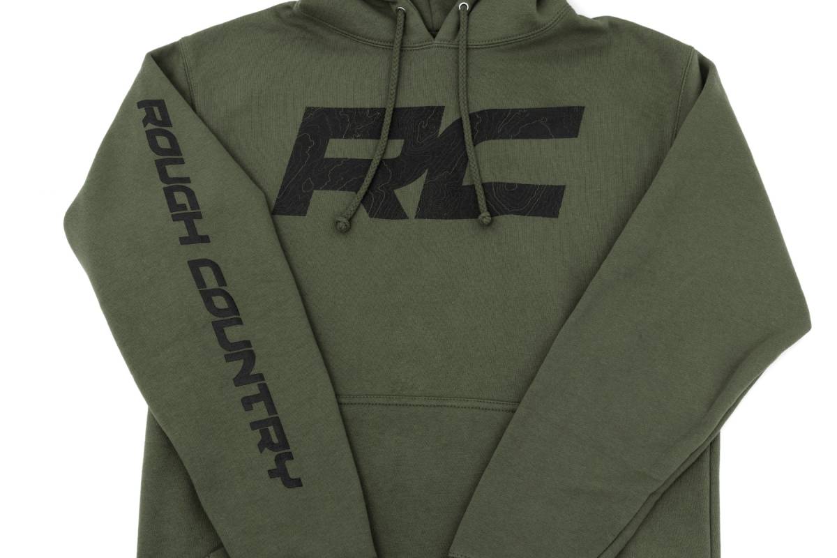 hit refresh with the newest addition from Rough Country. Get yours today! Our Rough Country Hoodie pullover is the perfect blend of function, style, and comfort. Made of a cotton and polyester blend, this army green hoodie features a black Rough Country wordmark on the chest as well as a down-the-sleeve for added style. With a drawcord with metal grommets plus hidden pockets, it s got all the features you count on when it comes to quality and functionality. Plus, ribbed cuffs and hem plus side-seamed panels provide extra strength so you know it ll last. Stylish enough to wear from day-to-day but tough enough to take on any challenge