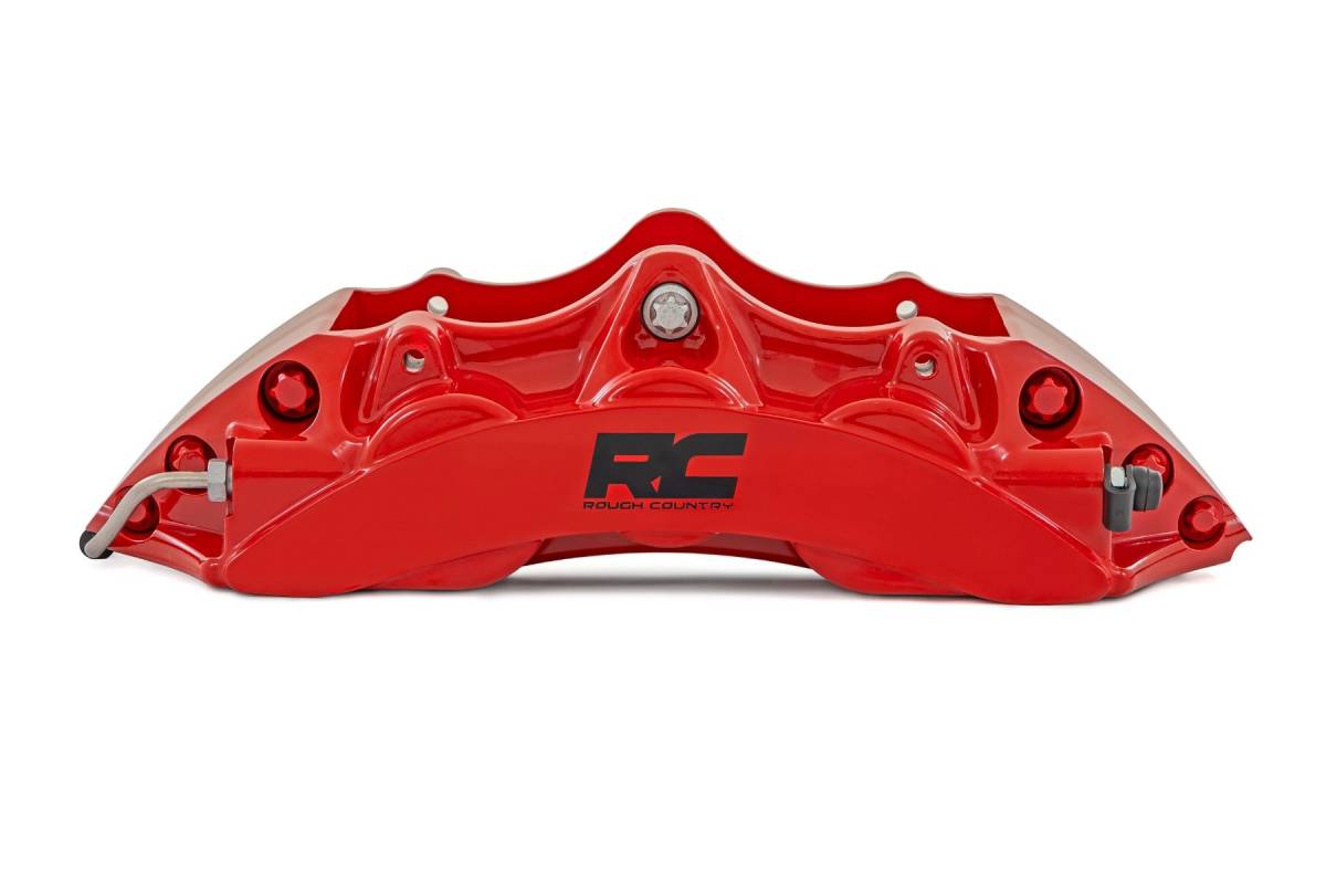 When you're out there pushing your rig to the limit, you need brakes that can keep up. Whether you're navigating rocky trails, or just handling the daily grind, stopping power matters. Lock in control and gain smooth, reliable stopping power every time you brake hard without losing performance.6-Piston Calipers: Feel the difference with our high-performance 6-piston calipers. They provide massive clamping force for quicker stops, even on steep inclines or heavy terrain. Lightweight & Powerful: Our calipers are built lightweight but with more surface area, giving you optimum stopping power without weighing you down. Stainless Steel Durability: With stainless steel pistons and brake lines, this kit delivers top performance with minimal maintenance. It's built tough to handle the harshest conditions. High-Temp Piston Seals: Our Brake Kit comes with seals that handle the heat like a pro, ensuring smooth, reliable performance on the road or off. Oversized, Drilled, and Slotted Rotors: These oversized, two-piece rotors are drilled and slotted to manage heat and debris efficiently. The result? Bigger stopping power that won t let you down, even in the roughest conditions. Ready-to-Go Installation: Everything you need, from banjo bolts to hardware, is included for a fast, secure install. Rough Country's Performance Brake Kit is made to conquer the toughest terrain, delivering reliable and smooth braking. Push your rig to the limit knowing you're in control.
