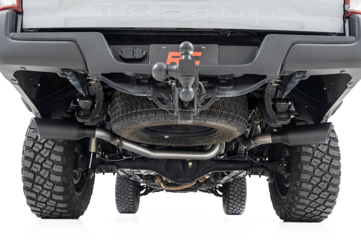 Unleash Your Truck's True Potential: Give your truck an aggressive, guttural sound and a bold, commanding presence with Rough Country's Dual Cat-Back Exhaust System for Toyota Tacoma models. This high-performance exhaust system is vehicle-specific tuned to maximize horsepower and torque, ensuring the perfect aftermarket exhaust note that will leave you grinning every time you step on the gas. Bold Looks, Powerful Performance: Rough Country's Dual Cat-Back Exhaust System is built for durability, featuring high-temp resistant, dual-wall 304 black stainless tips with the RC logo, offering both an aggressive look and superior strength. Vehicle-specific tuning ensures maximum performance, optimizing airflow for a boost in power. Installing this system has never been easier - each kit installs onto your vehicle's factory hangers and comes with 304 stainless clamps for easy installation (no welding required).Transform Your Truck Today: Upgrade your truck with the ultimate exhaust kit for enhanced performance, sound, and style. Experience the difference with Rough Country's Dual Cat-Back Exhaust System and take your driving experience to the next level.