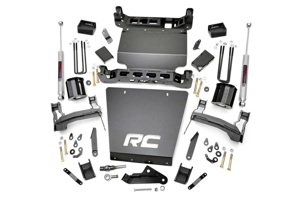 Commanding Lift. Aggressive Stance: Turn heads and tackle trails with Rough Country's 5-Inch Suspension Lift Kit for Chevy Silverado 1500/GMC Sierra 1500 trucks. This high-clearance lift kit delivers a bold, aggressive look while boosting your ride height to confidently clear up to 33-inch tires-even on factory 20-inch wheels. And thanks to the smart design that retains factory track width, you get all the benefits of a taller truck without compromising handling or alignment. Commanding Lift. Aggressive Stance: Every component in this kit is engineered for strength and longevity. Durable fabricated rear blocks offer greater integrity than standard cast designs, while laser-cut front and rear crossmembers, skid plates, and stout upper strut spacers provide a precise fit and rock-solid support. It's a complete package ready to dominate pavement and dirt alike. Commanding Lift. Aggressive Stance: Included N3 Series Shock Absorbers deliver application-specific valving for exceptional comfort and control across all terrains. Want even more performance? Opt for the upgraded N3 Loaded Struts-designed to replace traditional spacers with enhanced suspension response, simplified installation, and an even smoother ride. Commanding Lift. Aggressive Stance: This all-inclusive kit comes with heavy-duty sway-bar and differential drop brackets, premium hardware, and expert engineering backed by Rough Country's in-house R&D team. Whether you're cruising city streets or exploring off-grid, this lift kit brings out the best in your GM 1500.