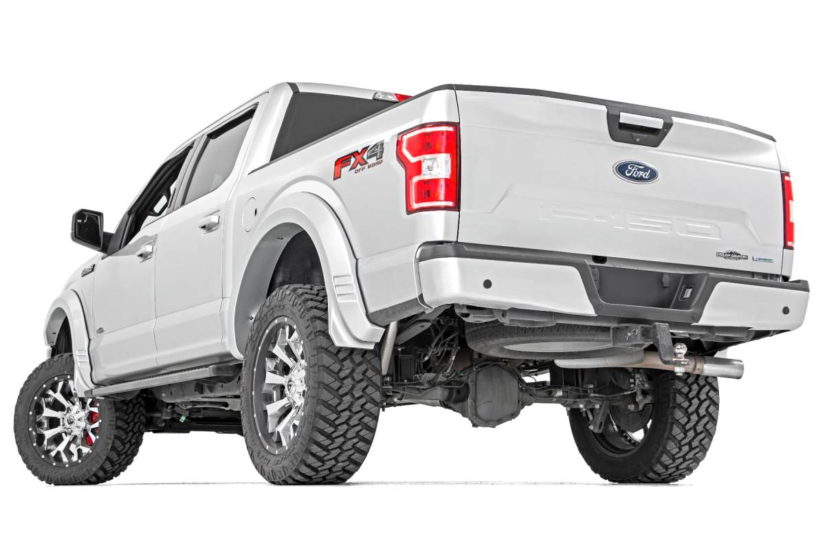 Rough Country's SF1 Fender Flares help you get the tough-looking finishing touch that your build deserves with a one-of-a-kind design. These flares complement the truck's body lines offering a clean look that will turn heads. The SF1 flare design gives the perfect amount of additional tire coverage for an oversized wheel and tire package and feature an integrated rear "mud catcher" to help reduce tire sling down the truck side. They are easy to install on your F-150, with excellent fitment right out of the box and includes all necessary hardware. The construction of these flares is from a durable ABS material that is both UV resistant for an uncoated install or paint-ready for a custom color match look. Not only will you get the utility you need from these flares, but you'll also have a unique and aggressive look for your truck. Whether you're looking for functionality or an accessory to tie your lift, wheels and tires together, Rough Country's SF1 fender flares deliver on all fronts.
