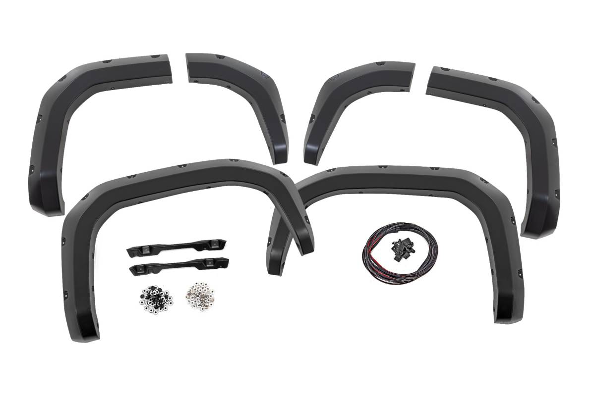 Aggressive Style, Serious Coverage: Give your Toyota 4Runner a commanding new look with Rough Country's Pocket Fender Flares. With 5.75 inches of added flare height and 1.75 inches of extended tire coverage, these flares offer maximum protection against rocks, mud, and road debris on or off the trail. Their rugged flat black finish and bold, pocket-style design instantly upgrade your 4Runner's stance, while the paintable surface lets you customize the look to match your ride perfectly. Engineered for Adventure: Built from high-strength Tri-Blend ABS, these flares are tough enough for whatever terrain you throw at them. Designed exclusively for the third-generation 4Runner, they feature a precision-molded fit and integrated UV protection to prevent cracking, fading, or warping even under harsh sun or trail abuse. Whether you're crawling over rocks or cruising through the city, these flares deliver the durability and style your 4Runner deserves. Easy Install, No Compromise: Install is quick and drill-free thanks to a direct bolt-on design, no cutting, no hassle. Each set includes corrosion-resistant black and silver rivet-style hardware for a rugged custom look. And when it's time to go back to stock, removal is just as easy. Backed by Rough Country's 3-Year Limited Warranty, you'll enjoy peace of mind knowing your upgrade is built to last. Elevate your 4Runner with fender flares that blend function, form, and off-road attitude all in one package.
