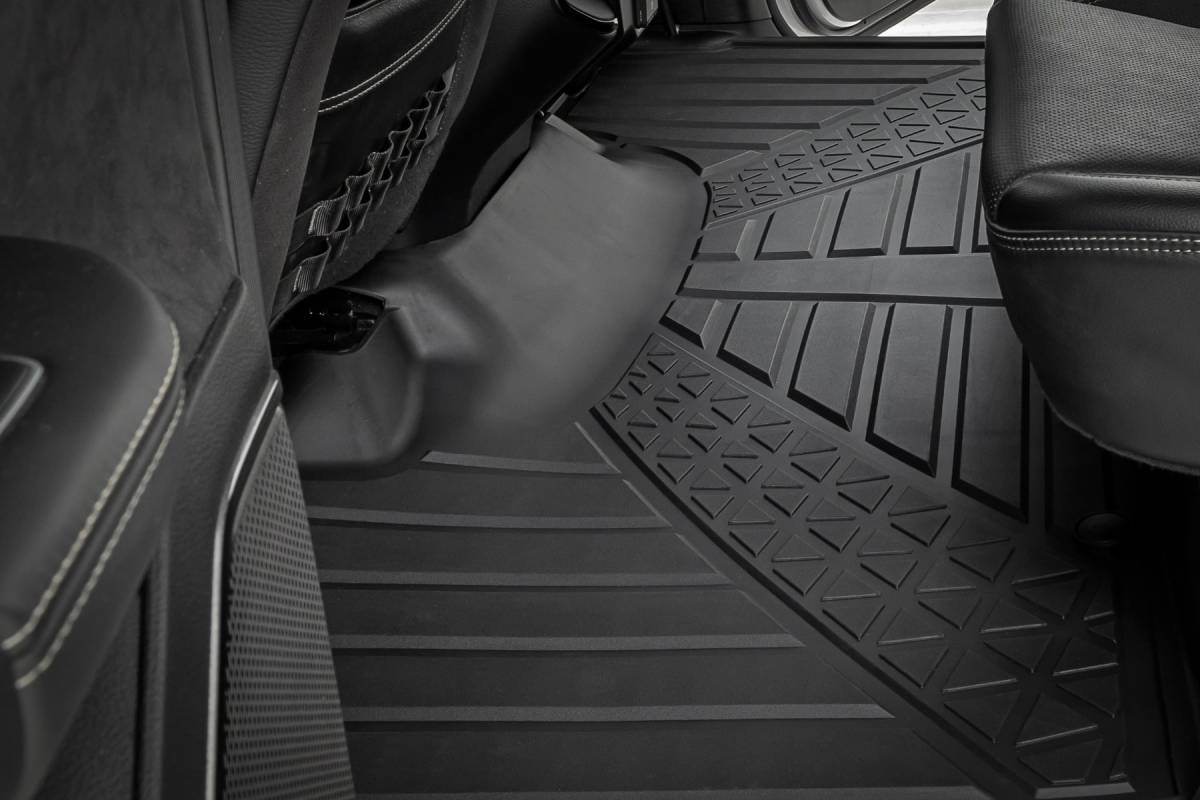 Introducing Flex-Fit floor mats the ultimate enhancement for your truck's interior and built tough to handle any challenge. Crafted from premium rubber-like material, these mats are as durable as they come, perfectly tailored to fit your truck's unique shape for a seamless finish. Stock floor mats just don't cut it for adventurers. They get trashed by mud, don't hold up to spills, and leave your carpets a mess. Give your ride the all-weather protection it deserves with Rough Country's Flex-Fit Floor Mats, the perfect solution for keeping your vehicle clean and protected. All-Weather Protection: Engineered to fit your vehicle perfectly, these mats provide top-notch defense against snow, mud, sand, saltwater, and more. Spill Saver Lip: Don't sweat the spills! Our mats feature a Spill Saver Lip that prevents liquids from reaching your carpet, so you can enjoy your coffee on the go without worry. Non-Slip, Textured Surface: Stay in control no matter the terrain with our mats' non-slip, textured surface, designed to keep your feet firmly planted while driving. Easy to Clean and Maintain: Cleaning up is a breeze! These mats are detachable and easy to clean, so you can spend less time on maintenance and more time hitting the road. Premium Materials: Constructed from a rubber-like TPE material, these mats are built to withstand extreme temperatures without cracking or warping. They will stay flexible and functional for the long haul. Effortless Installation: Forget wrestling with bulky mats. Flex-Fit Mats slide right into place for a quick and frustration-free installation. Upgrade your truck's defense against the elements with Rough Country's Flex-Fit Floor Mats. They'll keep your carpets looking fresh and give you peace of mind on every adventure.