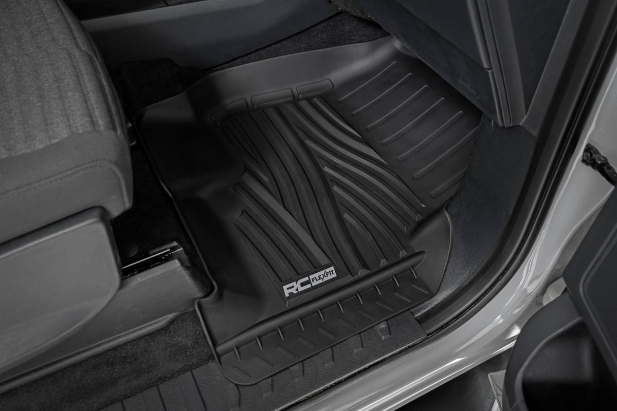 Introducing Flex-Fit floor mats the ultimate enhancement for your truck's interior and built tough to handle any challenge. Crafted from premium rubber-like material, these mats are as durable as they come, perfectly tailored to fit your truck's unique shape for a seamless finish. Stock floor mats just don't cut it for adventurers. They get trashed by mud, don't hold up to spills, and leave your carpets a mess. Give your ride the all-weather protection it deserves with Rough Country's Flex-Fit Floor Mats, the perfect solution for keeping your vehicle clean and protected. All-Weather Protection: Engineered to fit your vehicle perfectly, these mats provide top-notch defense against snow, mud, sand, saltwater, and more. Spill Saver Lip: Don't sweat the spills! Our mats feature a Spill Saver Lip that prevents liquids from reaching your carpet, so you can enjoy your coffee on the go without worry. Non-Slip, Textured Surface: Stay in control no matter the terrain with our mats' non-slip, textured surface, designed to keep your feet firmly planted while driving. Easy to Clean and Maintain: Cleaning up is a breeze! These mats are detachable and easy to clean, so you can spend less time on maintenance and more time hitting the road. Premium Materials: Constructed from a rubber-like TPE material, these mats are built to withstand extreme temperatures without cracking or warping. They will stay flexible and functional for the long haul. Effortless Installation: Forget wrestling with bulky mats. Flex-Fit Mats slide right into place for a quick and frustration-free installation. Upgrade your truck's defense against the elements with Rough Country's Flex-Fit Floor Mats. They'll keep your carpets looking fresh and give you peace of mind on every adventure.