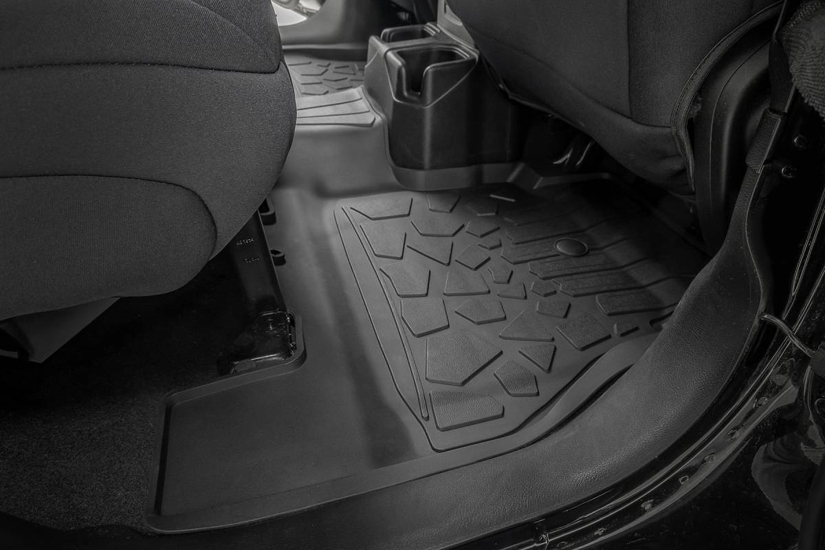 Introducing Flex-Fit floor mats the ultimate enhancement for your truck's interior and built tough to handle any challenge. Crafted from premium rubber-like material, these mats are as durable as they come, perfectly tailored to fit your truck's unique shape for a seamless finish. Stock floor mats just don't cut it for adventurers. They get trashed by mud, don't hold up to spills, and leave your carpets a mess. Give your ride the all-weather protection it deserves with Rough Country's Flex-Fit Floor Mats, the perfect solution for keeping your vehicle clean and protected. All-Weather Protection: Engineered to fit your vehicle perfectly, these mats provide top-notch defense against snow, mud, sand, saltwater, and more. Spill Saver Lip: Don't sweat the spills! Our mats feature a Spill Saver Lip that prevents liquids from reaching your carpet, so you can enjoy your coffee on the go without worry. Non-Slip, Textured Surface: Stay in control no matter the terrain with our mats' non-slip, textured surface, designed to keep your feet firmly planted while driving. Easy to Clean and Maintain: Cleaning up is a breeze! These mats are detachable and easy to clean, so you can spend less time on maintenance and more time hitting the road. Premium Materials: Constructed from a rubber-like TPE material, these mats are built to withstand extreme temperatures without cracking or warping. They will stay flexible and functional for the long haul. Effortless Installation: Forget wrestling with bulky mats. Flex-Fit Mats slide right into place for a quick and frustration-free installation. Upgrade your truck's defense against the elements with Rough Country's Flex-Fit Floor Mats. They'll keep your carpets looking fresh and give you peace of mind on every adventure.
