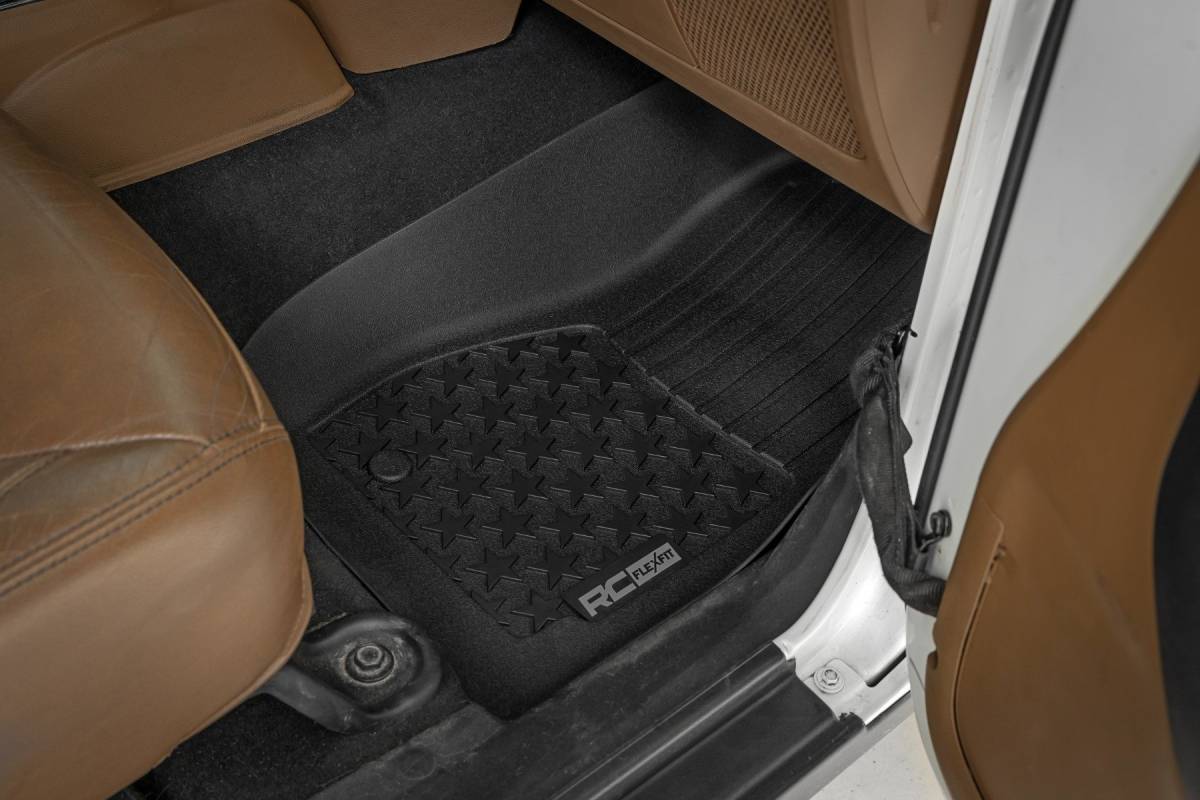 Introducing Flex-Fit floor mats the ultimate enhancement for your Jeep's interior and built tough to handle any challenge. Crafted from premium rubber-like material, these mats are as durable as they come, perfectly tailored to fit your Jeep's unique shape for a seamless finish. Stock floor mats just don't cut it for adventurers. They get trashed by mud, don't hold up to spills, and leave your carpets a mess. Give your ride the all-weather protection it deserves with Rough Country's Flex-Fit Floor Mats, the perfect solution for keeping your vehicle clean and protected. All-Weather Protection: Engineered to fit your vehicle perfectly, these mats provide top-notch defense against snow, mud, sand, saltwater, and more. Spill Saver Lip: Don't sweat the spills! Our mats feature a Spill Saver Lip that prevents liquids from reaching your carpet, so you can enjoy your coffee on the go without worry.Non-Slip, Textured Surface: Stay in control no matter the terrain with our mats' non-slip, textured surface, designed to keep your feet firmly planted while driving. Easy to Clean and Maintain: Cleaning up is a breeze! These mats are detachable and easy to clean, so you can spend less time on maintenance and more time hitting the road. Premium Materials: Constructed from a rubber-like TPE material, these mats are built to withstand extreme temperatures without cracking or warping. They will stay flexible and functional for the long haul. Effortless Installation: Forget wrestling with bulky mats. Flex-Fit Mats slide right into place for a quick and frustration-free installation. Upgrade your Jeep's defense against the elements with Rough Country's Flex-Fit Floor Mats. They'll keep your carpets looking fresh and give you peace of mind on every adventure.