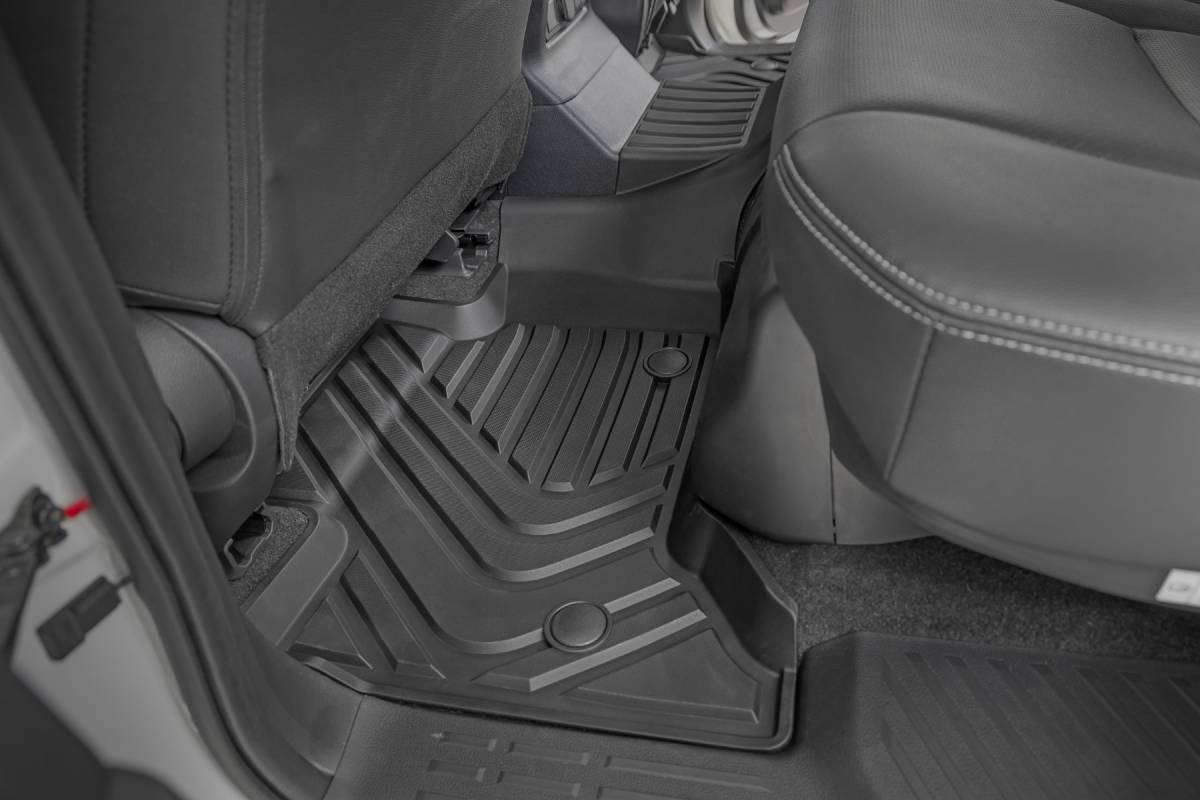 Introducing Flex-Fit floor mats - the ultimate enhancement for your vehicle's interior and built tough to handle any challenge. Crafted from premium rubber-like material, these mats are as durable as they come, perfectly tailored to fit your vehicle's unique shape for a seamless finish. Stock floor mats just don't cut it for adventurers. They get trashed by mud, don't hold up to spills, and leave your carpets a mess. Give your ride the all-weather protection it deserves with Rough Country's Flex-Fit Floor Mats, the perfect solution for keeping your vehicle clean and protected. All-Weather Protection: Engineered to fit your vehicle perfectly, these mats provide top-notch defense against snow, mud, sand, saltwater, and more. Spill Saver Lip: Don't sweat the spills! Our mats feature a Spill Saver Lip that prevents liquids from reaching your carpet, so you can enjoy your coffee on the go without worry.Non-Slip, Textured Surface: Stay in control no matter the terrain with our mats' non-slip, textured surface, designed to keep your feet firmly planted while driving. Easy to Clean and Maintain: Cleaning up is a breeze! These mats are detachable and easy to clean, so you can spend less time on maintenance and more time hitting the road. Premium Materials: Constructed from a rubber-like TPE material, these mats are built to withstand extreme temperatures without cracking or warping. They will stay flexible and functional for the long haul. Effortless Installation: Forget wrestling with bulky mats. Flex-Fit Mats slide right into place for a quick and frustration-free installation. Upgrade your vehicle's defense against the elements with Rough Country's Flex-Fit Floor Mats. They'll keep your carpets looking fresh and give you peace of mind on every adventure.