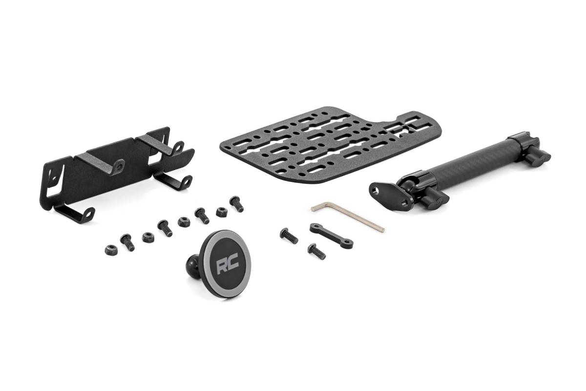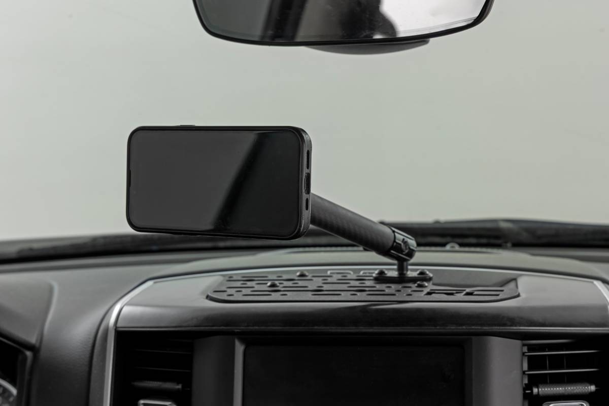 Rough Country's Dash Mount Kit for the fifth-generation Ram 1500 puts an end to the hassle of fumbling for your phone. This innovative mounting solution keeps your device secure, visible, and always within reach, so you can stay focused on the road ahead. With a sleek, organized design, it blends seamlessly into your Ram's interior while delivering rugged functionality for daily driving or off-road adventures. Effortless Accessibility: No more digging in cup holders or awkward scrambles mid-drive. This dash mount positions your phone or device right where you need it, providing quick and easy access whether you're navigating traffic or hitting the trails. Clutter-Free Interior: Maintain a clean, organized cabin by eliminating loose devices from your seats and console. This kit ensures your essentials stay neatly mounted, creating a factory-style fit and finish. Rugged Construction: Built from heavy-duty 14-gauge powder-coated steel, this mount delivers maximum durability, corrosion resistance, and strength to withstand tough environments and long-term use. Simple, Bolt-On Install: Installation is 100% bolt-on with no drilling required. In just minutes, you'll have a secure, reliable mounting point without the need for extra tools or modifications. Customizable Options: Available with your choice of 8-inch or 10-inch extension arms, plus MagSafe or non-MagSafe compatibility, so you can tailor your setup to your exact needs. From long commutes to weekend off-road escapes, Rough Country's Dash Mount Kit gives your Ram 1500 a professional, functional upgrade that keeps your device locked in place and your focus on the drive.