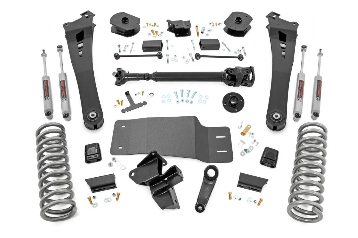 Commanding Lift. Confident Performance: Transform your RAM 3500 with Rough Country's 5-Inch Lift Kit, engineered for bold looks and off-road domination. Featuring linear coil springs, a heavy-duty front driveshaft, and application-valved N3 shock absorbers, this kit delivers increased ground clearance, leveled stance, and trail-tested performance, all while maintaining a smooth, factory-like ride. Precision Suspension Engineering: Maintaining proper suspension geometry is critical for both on- and off-road control. This kit includes a drop pitman arm to correct steering angles and a track bar drop bracket to keep your front axle perfectly centered, ensuring stable, predictable handling at every turn. Heavy-Duty Radius Arms: Custom radius arms bolt directly to factory mounts and retain factory-like angles. Outfitted with premium rubber bushings, they minimize vibration and noise while maximizing ride comfort and suspension travel. Linear Coil Springs for Consistency: Front and rear linear-rate coil springs offer a reliable, controlled ride with balanced articulation and load handling, perfect for daily driving, towing, or backcountry exploring. Upgraded Front Driveshaft Included: This kit comes complete with a high-clearance front driveshaft designed to accommodate added articulation and drivetrain angles, no need for costly aftermarket upgrades. Includes N3 Series Shocks: Rough Country's N3 shocks are specifically valved for your RAM 3500, delivering balanced performance both on the highway and in rugged off-road environments. Clears 37-Inch Tires with Ease: Run aggressive 37-inch tires with confidence. This kit gives your RAM the clearance it needs for true off-road capability and a head-turning stance.