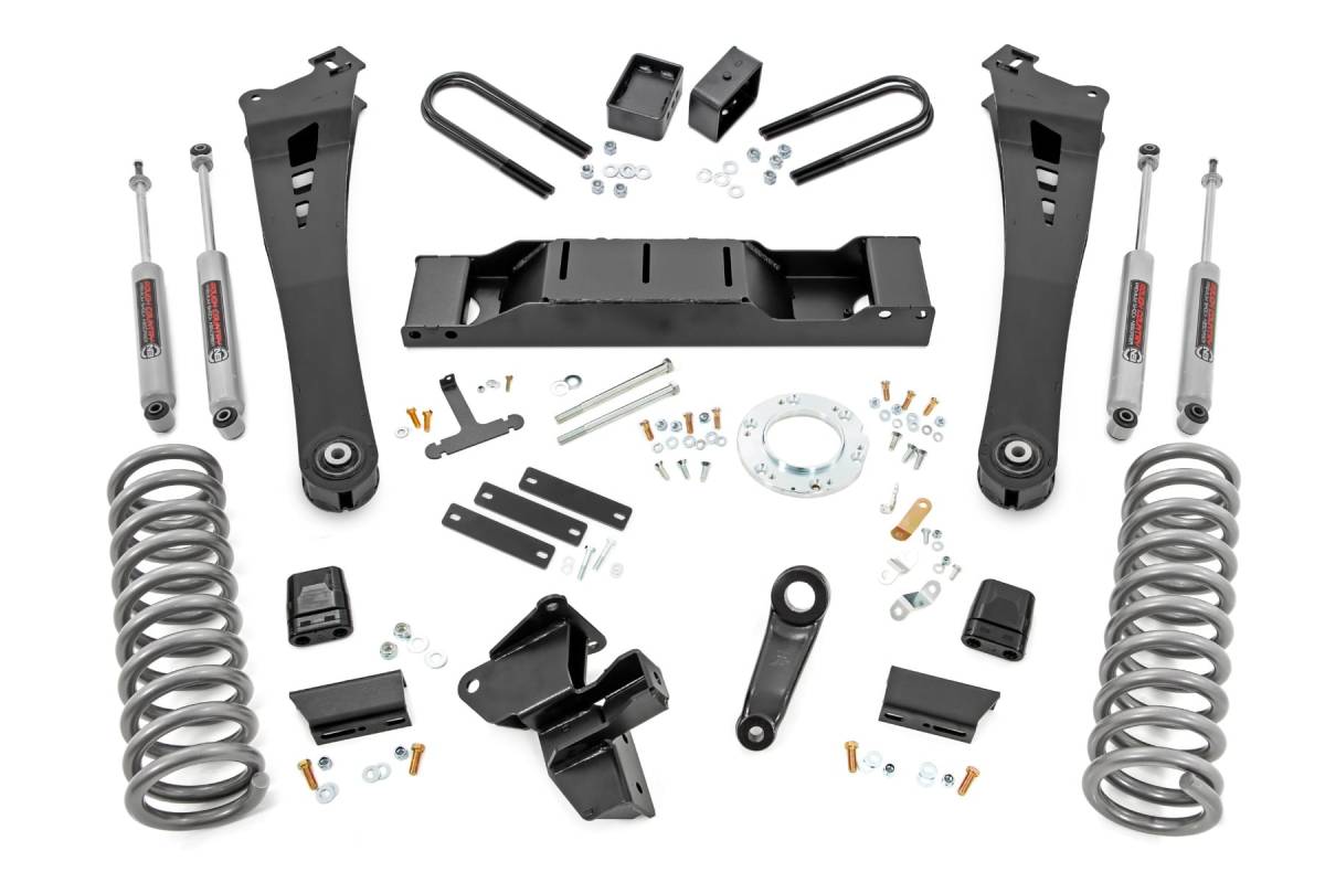 Compliment your RAM 3500's aggressive, good looks with Rough Country's 5-inch Lift Kit for dually models. RAM Trucks come with a wealth of impressive features right from the factory. Rough Country's new 5-inch kit was engineered to retain these impressive factory specs while bumping up performance and durability where it's needed most. The result is a lifted beast with a mean profile and lush ride-quality that'll make other RAM owners wonder where you got yours from! When changing a vehicle's suspension, the key to preserving ride quality is in keeping the geometry of all suspension components as close to their factory angles as possible. Rough Country's 5-inch Suspension kit features a set of ultra-durable Radius Arms, precision fit to bolt right into the factory mounts for an easier install and a more factory-like angle. These beefy, upgraded Radius Arms also feature a durable, durable rubber bushings for maximum vibration absorption. This kit also includes a set of front, lifted coil springs for unparalleled ride quality from your lifted Dodge Ram.