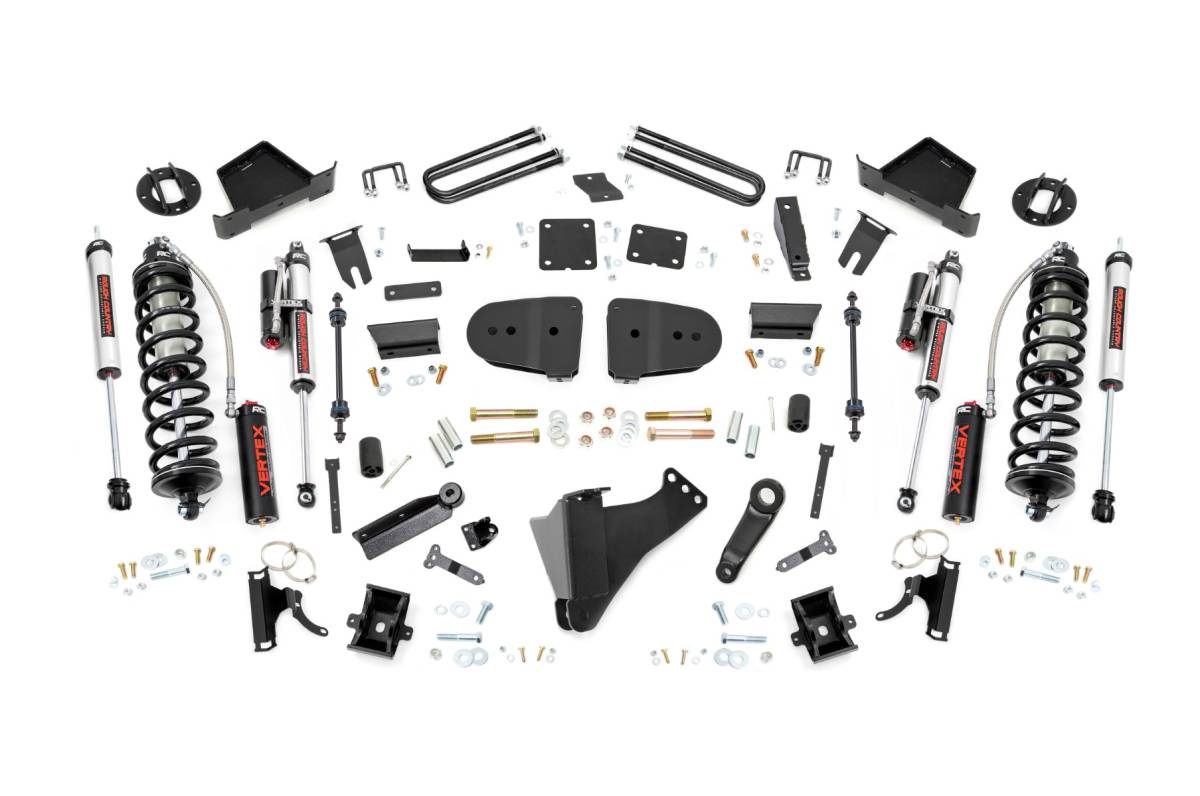 Rear blocks are also custom-engineered to prevent axle wrap, preserving your ride quality mile after mile. Pair with optional V2 or Vertex rear shocks for four-corner performance you can feel. Smarter Installation. Better Results: This bolt-on system is designed for a hassle-free setup no cutting or drilling required. Top-mounted reservoir brackets offer clean, secure placement, and front-to-rear leveling eliminates factory rake for a more aggressive, balanced look. Boosted ground clearance allows you to tackle trails with ease, while enhanced suspension geometry keeps your Super Duty performing as it should. Peace of Mind Included: Backed by Rough Country's Limited Lifetime Replacement Warranty, this 6-Inch Coilover Suspension Lift Kit is built to last and protected from structural or workmanship defects from day one. Drive harder, ride smoother, and lift smarter with Rough Country. Conquer with Confidence: Elevate your fifth-generation Ford Super Duty with Rough Country's 6-Inch Coilover Suspension Lift Kit. Designed for serious off-roaders and daily drivers alike, this performance-driven system delivers aggressive ride height while preserving smooth, factory-like comfort. Run up to 37-inch tires with confidence and dominate terrain like never before. Precision Engineering. Premium Ride: Fine-tune your stance and clearance with fully adjustable Vertex coilovers that dramatically enhance damping performance for a smoother, more responsive ride. Each coilover features an 8-stage adjustable, 2.5-inch piston with nitrogen-charged monotube design and external reservoirs offering 56% more fluid capacity than standard shocks for unmatched heat dissipation and consistency. A secondary V2 front monotube shock adds even more stability and control, making this a dual-shock setup that stands above the rest. Built to Outlast: Heavy-duty 1/4-inch fabricated coilover mounts ensure maximum strength and durability under the harshest conditions. Radius arm drop brackets provide proper caster correction to maintain factory-like handling, while heavy-duty fabricated rear lift blocks deliver superior strength compared to cast alternatives.